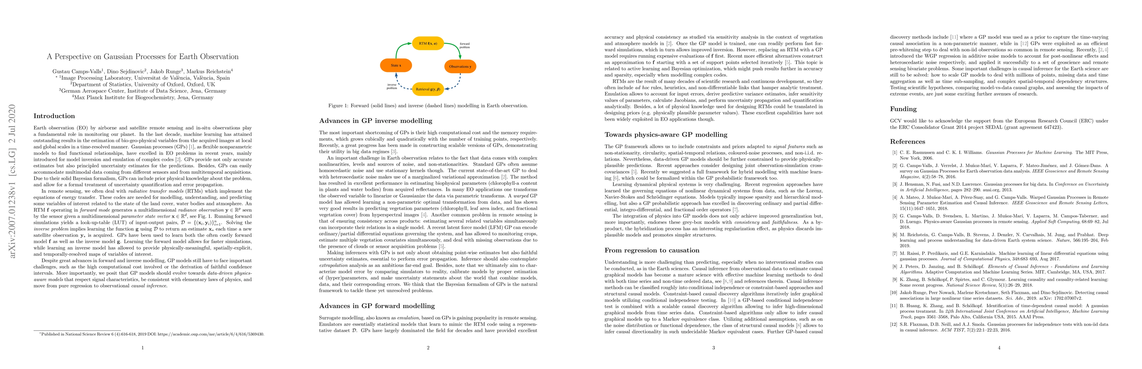 Earth observation (EO) by airborne and satellite remote sensing and in-situ observations play a fundamental role in monitoring our planet. In the last decade, machine learning and Gaussian processes (GPs) in particular has attained outstanding results in the estimation of bio-geo-physical variables from the acquired images at local and global scales in a time-resolved manner. GPs provide not only accurate estimates but also principled uncertainty estimates for the predictions, can easily accommodate multimodal data coming from different sensors and from multitemporal acquisitions, allow the introduction of physical knowledge, and a formal treatment of uncertainty quantification and error propagation. Despite great advances in forward and inverse modelling, GP models still have to face important challenges that are revised in this perspective paper. GP models should evolve towards data-driven physics-aware models that respect signal characteristics, be consistent with elementary laws of physics, and move from pure regression to observational causal inference.