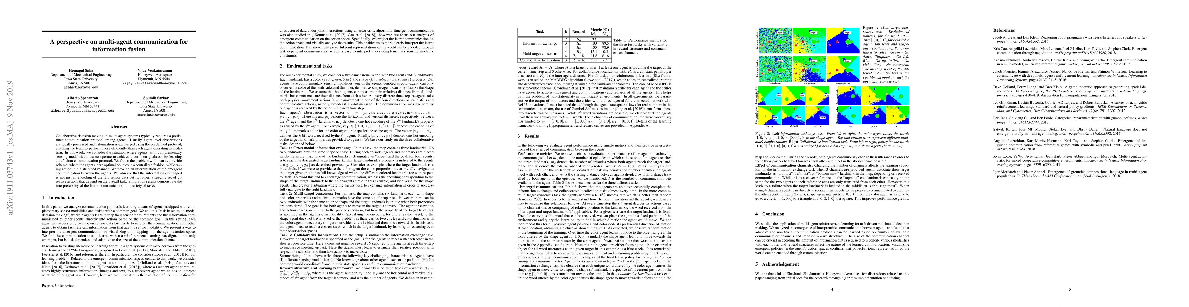 Collaborative decision making in multi-agent systems typically requires a predefined communication protocol among agents. Usually, agent-level observations are locally processed and information is exchanged using the predefined protocol, enabling the team to perform more efficiently than each agent operating in isolation. In this work, we consider the situation where agents, with complementary sensing modalities must co-operate to achieve a common goal/task by learning an efficient communication protocol. We frame the problem within an actor-critic scheme, where the agents learn optimal policies in a centralized fashion, while taking action in a distributed manner. We provide an interpretation of the emergent communication between the agents. We observe that the information exchanged is not just an encoding of the raw sensor data but is, rather, a specific set of directive actions that depend on the overall task. Simulation results demonstrate the interpretability of the learnt communication in a variety of tasks.