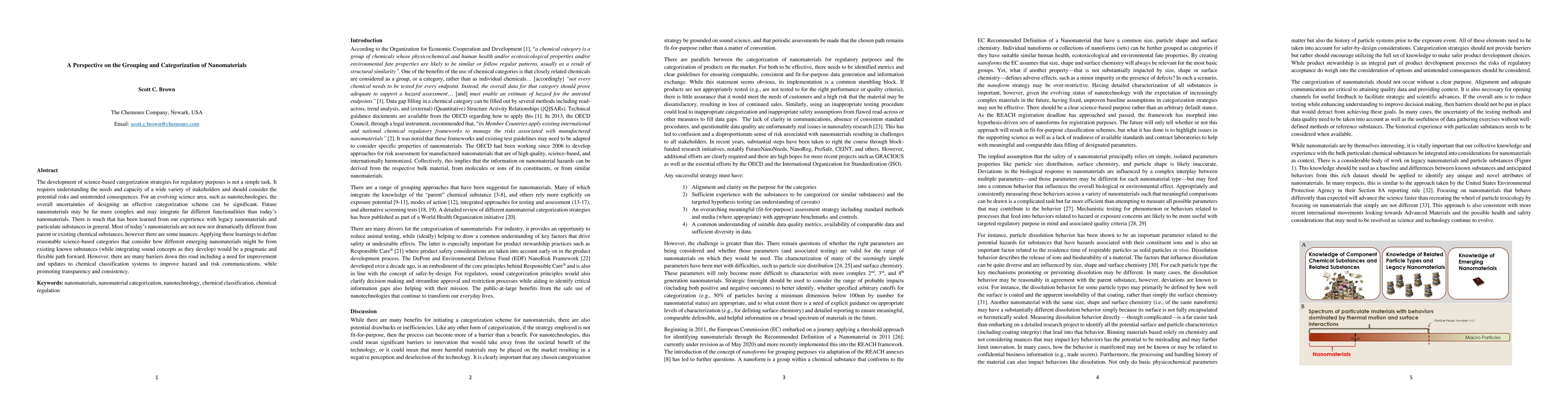 The development of science-based categorization strategies for regulatory purposes is not a simple task. It requires understanding the needs and capacity of a wide variety of stakeholders and should consider the potential risks and unintended consequences. For an evolving science area, such as nanotechnologies, the overall uncertainties of designing an effective categorization scheme can be significant. Future nanomaterials may be far more complex and may integrate far different functionalities than modern nanomaterials. There is much that has been learned from our experience with legacy nanomaterials and particulate substances in general. Most of the modern nanomaterials are not new nor dramatically different from parent or existing chemical substances, however there are some nuances. Applying these learnings to define reasonable science-based categories that consider how different emerging nanomaterials might be from existing known substances (while integrating sound concepts as they develop) would be a pragmatic and flexible path forward. However, there are many barriers down this road including a need for improvement and updates to chemical classification systems to improve hazard and risk communications, while promoting transparency and consistency.