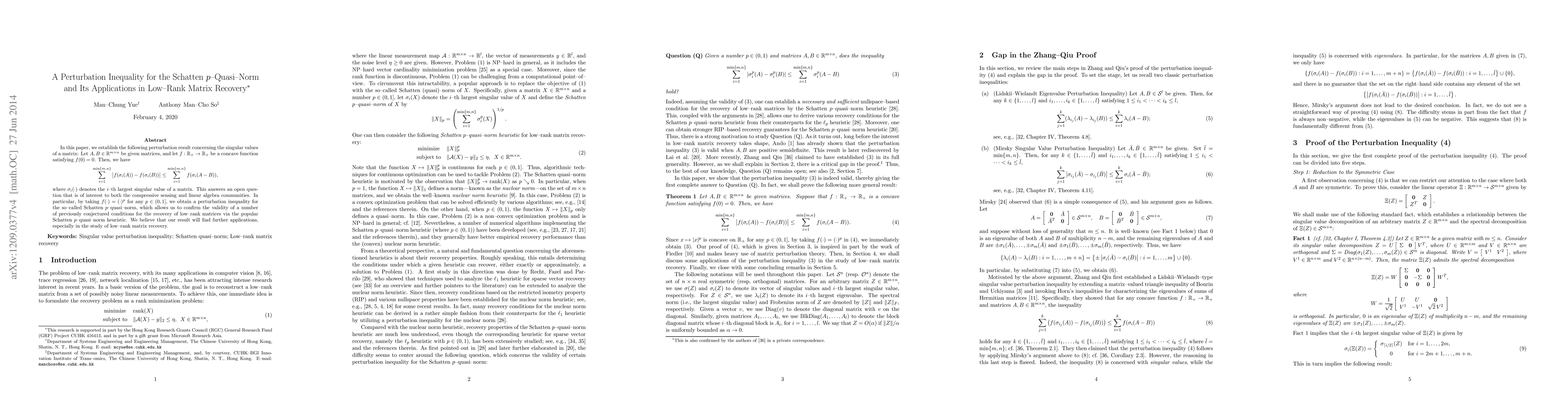 This paper establishes a perturbation inequality for the Schatten-$p$ quasi-norm, proving that the difference between the $p$-th power of singular values of two matrices is bounded by the $p$-th power of singular values of their difference. This result confirms conjectured conditions for low-rank matrix recovery and has potential applications in compressive sensing and linear algebra.