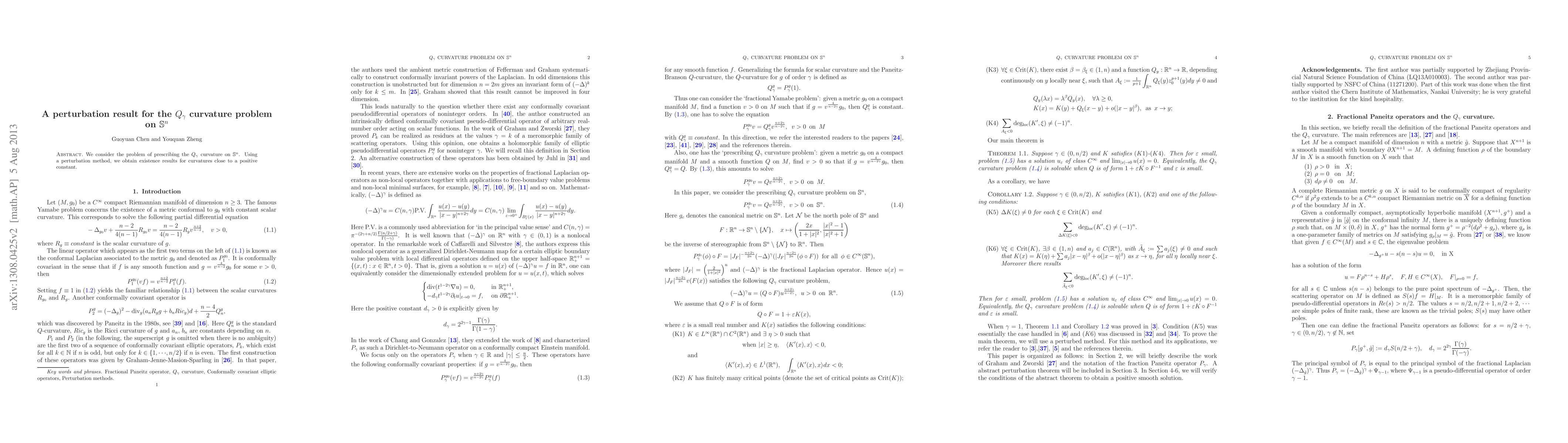 We consider the problem of prescribing the $Q_{\ gamma}$ curvature on $\mathbb{S}^n$. Using a perturbation method, we obtain existence results for curvatures close to a positive constant.