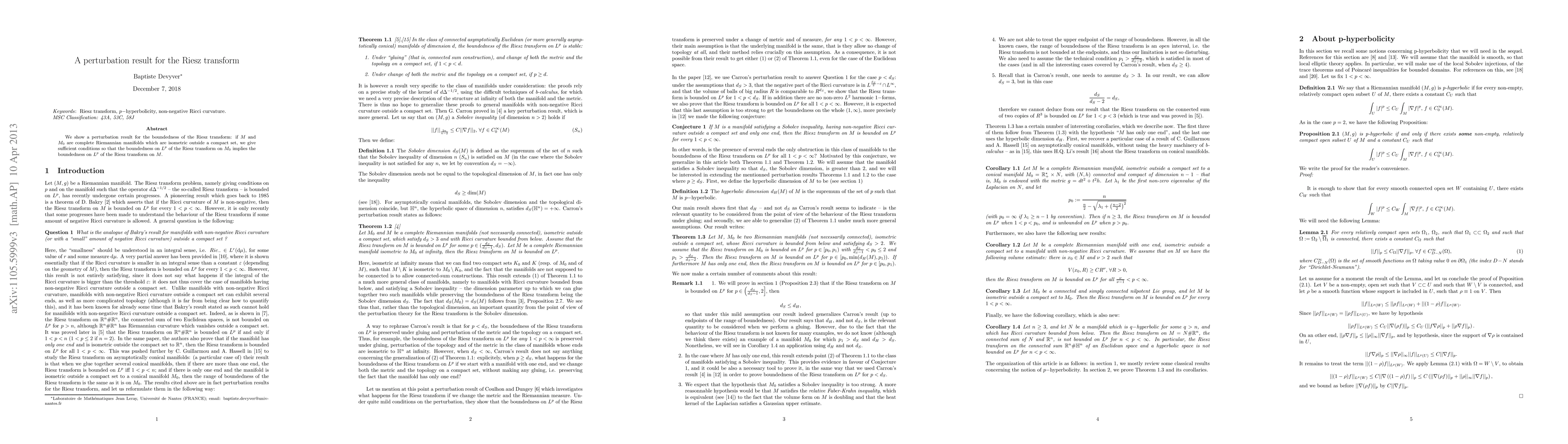 This paper demonstrates a perturbation result for the boundedness of the Riesz transform on complete Riemannian manifolds. It shows that if the Riesz transform on a reference manifold is bounded on $L^q$, the transform on a perturbed manifold is bounded on $L^p$ under certain hyperbolicity or end conditions.