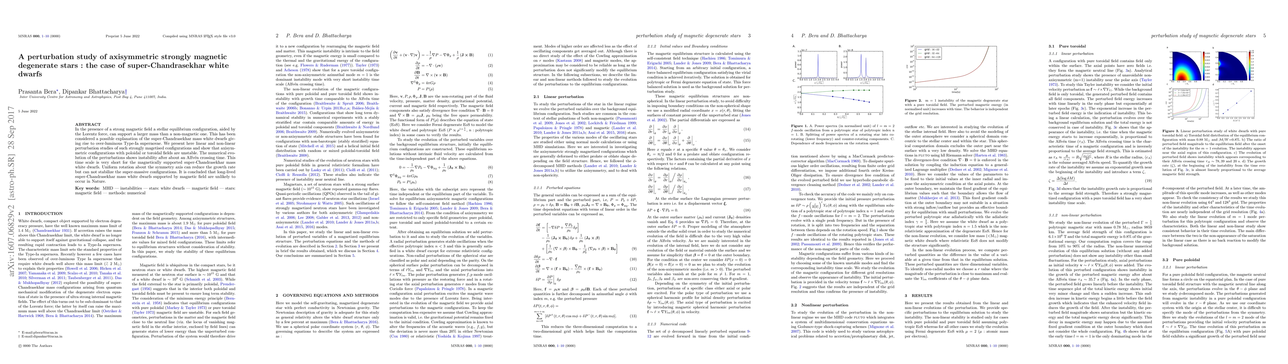 In the presence of a strong magnetic field a stellar equilibrium configuration, aided by the Lorentz force, can support a larger mass than a non-magnetic one. This has been considered a possible explanation of the super-Chandrasekhar mass white dwarfs giving rise to over-luminous Type-Ia supernovae. We present here linear and non-linear perturbation studies of such strongly magetised configurations and show that axisymmetric configurations with poloidal or toroidal fields are unstable. The numerical evolution of the perturbations shows instability after about an Alfv\'en crossing time. This time scale is very short for the magnetically supported super-Chandrasekhar mass white dwarfs. Uniform rotation about the symmetry axis can reduce the growth rate but can not stabilize the super-massive configurations. It is concluded that long-lived super-Chandrasekhar mass white dwarfs supported by magnetic field are unlikely to occur in Nature.