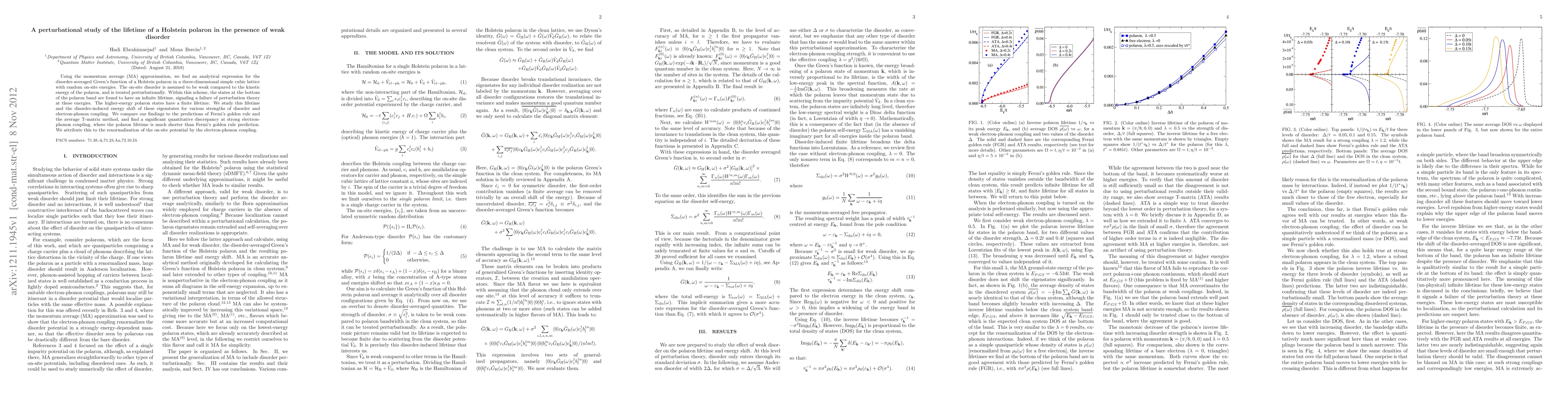 Using the momentum average (MA) approximation, we find an analytical expression for the disorder-averaged Green's function of a Holstein polaron in a three-dimensional simple cubic lattice with random on-site energies. The on-site disorder is assumed to be weak compared to the kinetic energy of the polaron, and is treated perturbationally. Within this scheme, the states at the bottom of the polaron band are found to have an infinite lifetime, signaling a failure of perturbation theory at these energies. The higher-energy polaron states have a finite lifetime. We study this lifetime and the disorder-induced energy shift of these eigenstates for various strengths of disorder and electron-phonon coupling. We compare our findings to the predictions of Fermi's golden rule and the average T-matrix method, and find a significant quantitative discrepancy at strong electron-phonon coupling, where the polaron lifetime is much shorter than Fermi's golden rule prediction. We attribute this to the renormalization of the on-site potential by the electron-phonon coupling.