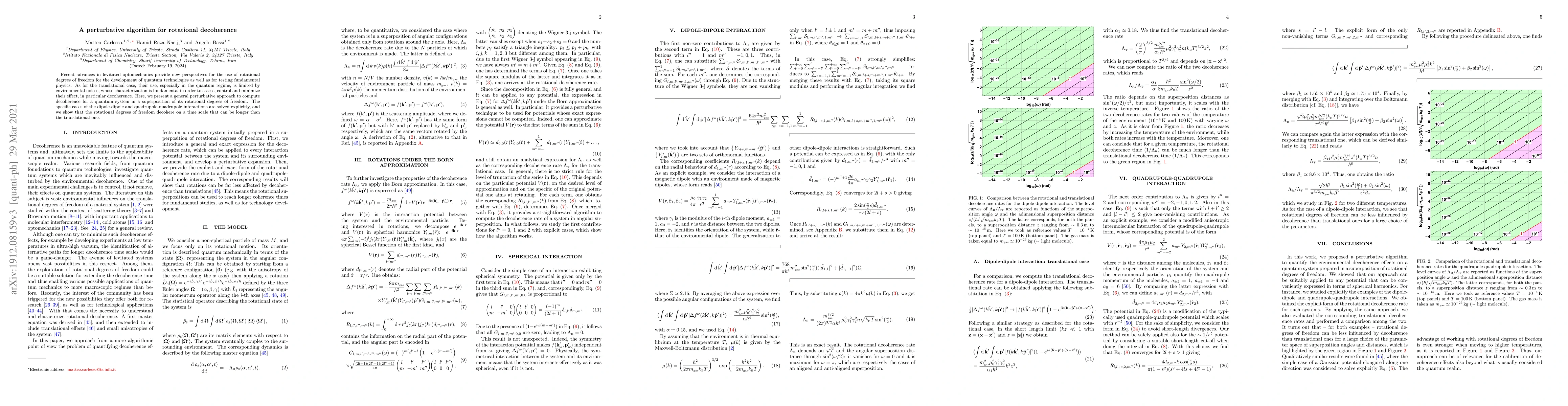 This paper presents a perturbative algorithm to compute rotational decoherence in levitated optomechanics systems, focusing on the dipole-dipole and quadrupole-quadrupole interactions. It finds that rotational decoherence can occur on a longer timescale than translational decoherence, which is crucial for quantum technologies and fundamental physics testing.