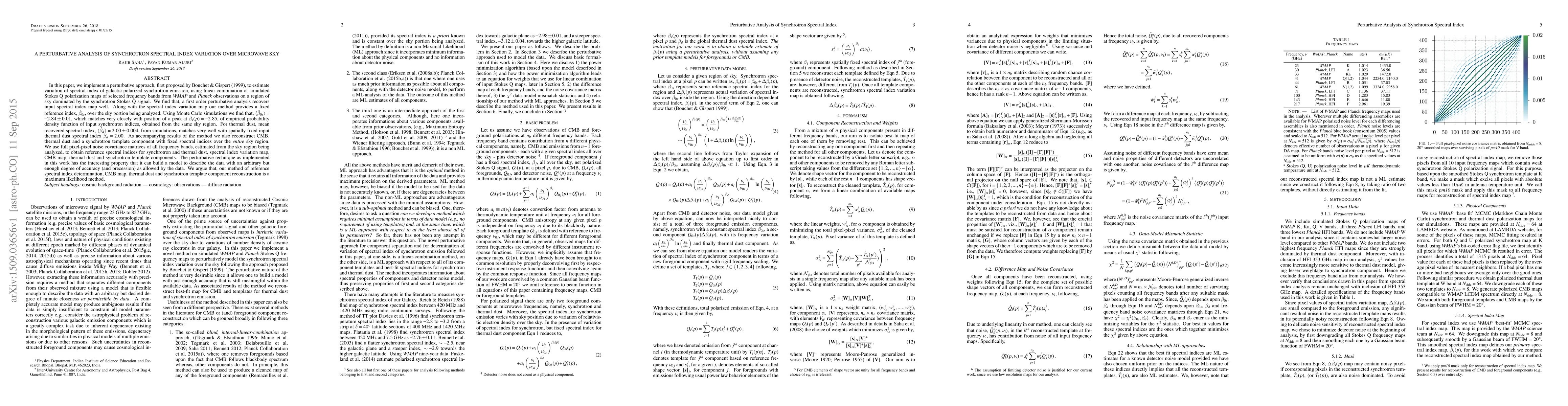 In this paper, we implement a perturbative approach, first proposed by Bouchet & Gispert (1999), to estimate variation of spectral index of galactic polarized synchrotron emission, using linear combination of simulated Stokes Q polarization maps of selected frequency bands from WMAP and Planck observations on a region of sky dominated by the synchrotron Stokes Q signal. We find that, a first order perturbative analysis recovers input spectral index map well. Along with the spectral index variation map our method provides a fixed reference index, \hat \beta_{0s}, over the sky portion being analyzed. Using Monte Carlo simulations we find that, <\hat \beta_{0s}> = -2.84 \pm 0.01, which matches very closely with position of a peak at \beta_s(p) = -2.85, of empirical probability density function of input synchrotron indices, obtained from the same sky region. For thermal dust, mean recovered spectral index, <\hat \beta_d> = 2.00 \pm 0.004, from simulations, matches very well with spatially fixed input thermal dust spectral index \beta_d = 2.00. As accompanying results of the method we also reconstruct CMB, thermal dust and a synchrotron template component with fixed spectral indices over the {\it entire} sky region. We use full pixel-pixel noise covariance matrices of all frequency bands, estimated from the sky region being analyzed, to obtain reference spectral indices for synchrotron and thermal dust, spectral index variation map, CMB map, thermal dust and synchrotron template components. The perturbative technique as implemented in this work has the interesting property that it can build a model to describe the data with an arbitrary but enough degree of accuracy (and precession) as allowed by the data. We argue that, our method of reference spectral index determination, CMB map, thermal dust and synchrotron template component reconstruction is a maximum likelihood method.