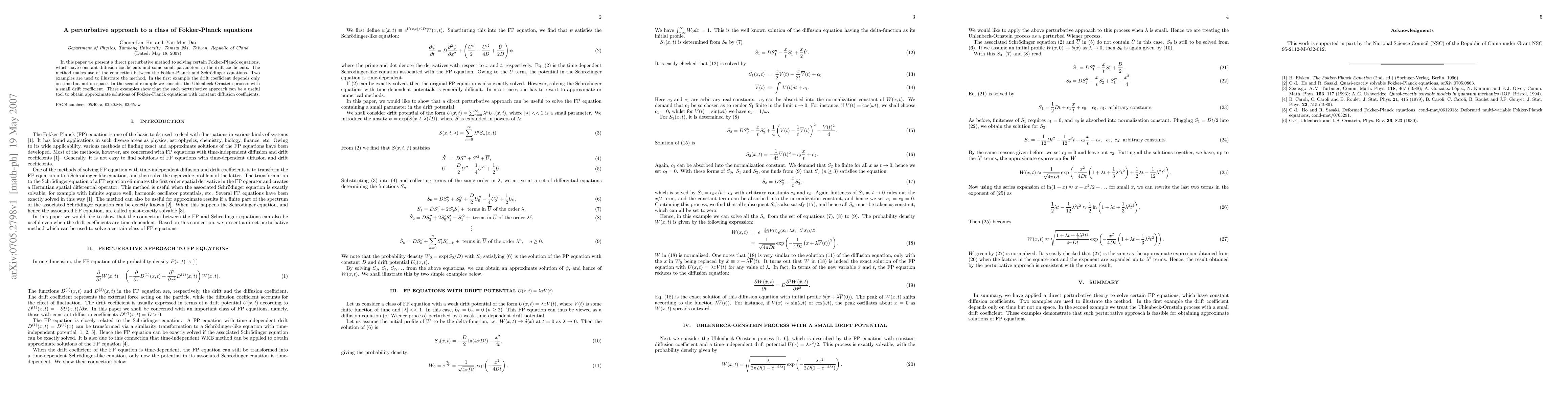 In this paper we present a direct perturbative method to solving certain Fokker-Planck equations, which have constant diffusion coefficients and some small parameters in the drift coefficients. The method makes use of the connection between the Fokker-Planck and Schr\"odinger equations. Two examples are used to illustrate the method. In the first example the drift coefficient depends only on time but not on space. In the second example we consider the Uhlenbeck-Ornstein process with a small drift coefficient. These examples show that the such perturbative approach can be a useful tool to obtain approximate solutions of Fokker-Planck equations with constant diffusion coefficients.