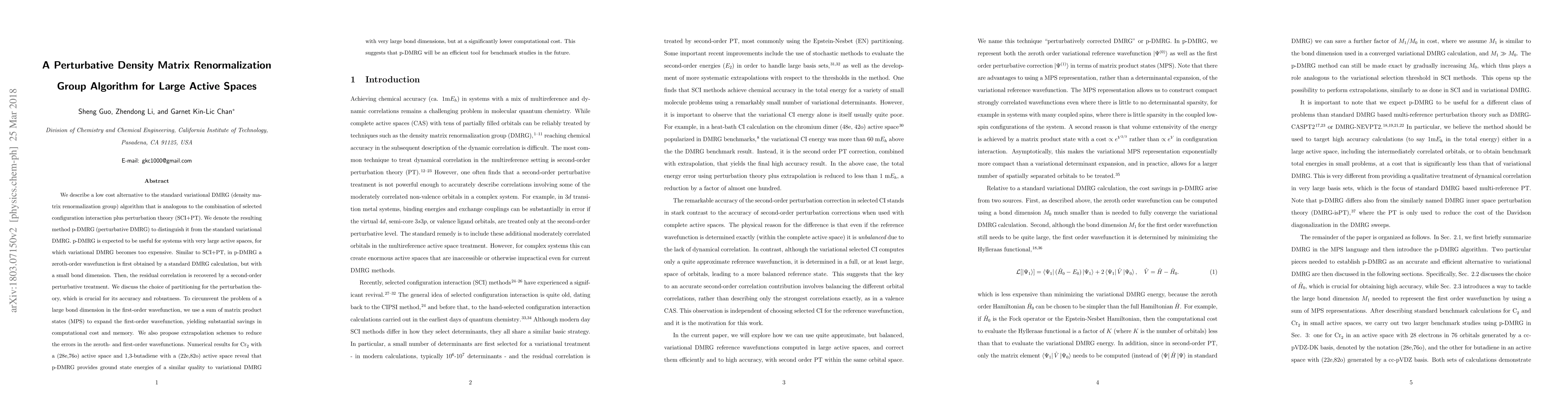 This paper introduces a perturbative density matrix renormalization group (p-DMRG) algorithm as a cost-effective alternative to standard variational DMRG for large active spaces. The method combines a low-cost initial DMRG calculation with a second-order perturbative treatment to recover residual correlation, significantly reducing computational costs and memory usage.