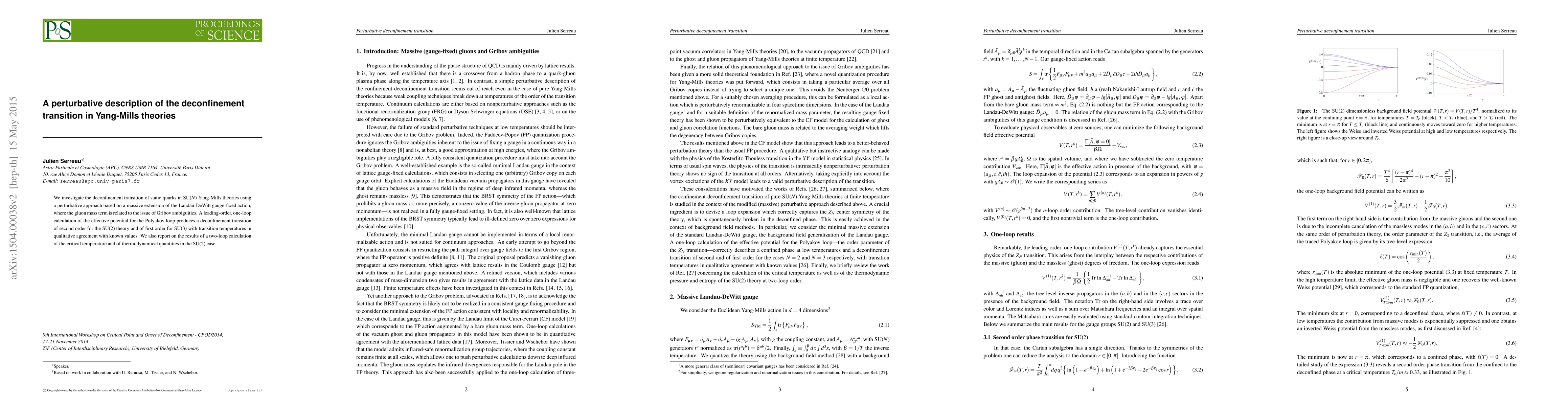 This paper uses a perturbative method to study the deconfinement transition in SU(N) Yang-Mills theories, finding a second-order transition for SU(2) and a first-order transition for SU(3) with temperatures matching known values. It also reports on two-loop calculations for the critical temperature and thermodynamic quantities in SU(2).