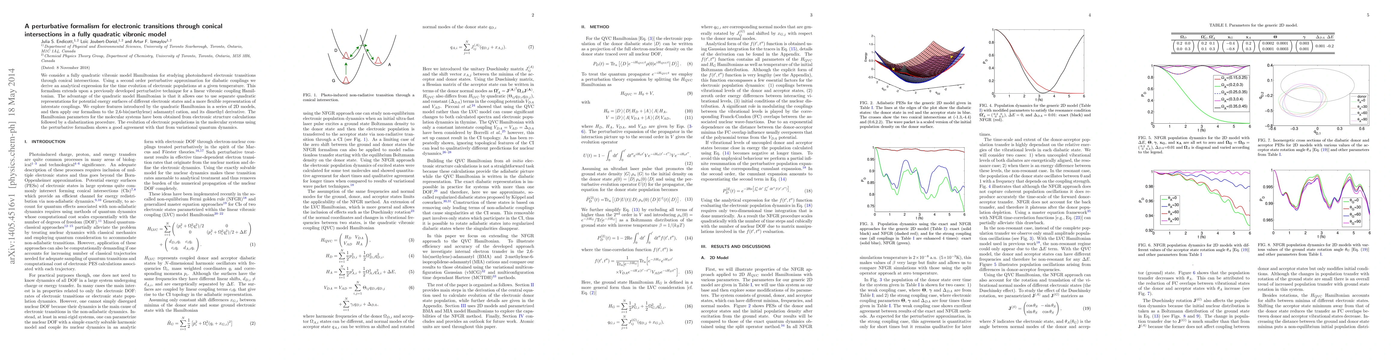 We consider a fully quadratic vibronic model Hamiltonian for studying photoinduced electronic transitions through conical intersections. Using a second order perturbative approximation for diabatic couplings we derive an analytical expression for the time evolution of electronic populations at a given temperature. This formalism extends upon a previously developed perturbative technique for a linear vibronic coupling Hamiltonian. The advantage of the quadratic model Hamiltonian is that it allows one to use separate quadratic representations for potential energy surfaces of different electronic states and a more flexible representation of interstate couplings. We explore features introduced by the quadratic Hamiltonian in a series of 2D models, and then apply our formalism to the 2,6-bis(methylene) adamantyl cation, and its dimethyl derivative. The Hamiltonian parameters for the molecular systems have been obtained from electronic structure calculations followed by a diabatization procedure. The evolution of electronic populations in the molecular systems using the perturbative formalism shows a good agreement with that from variational quantum dynamics.