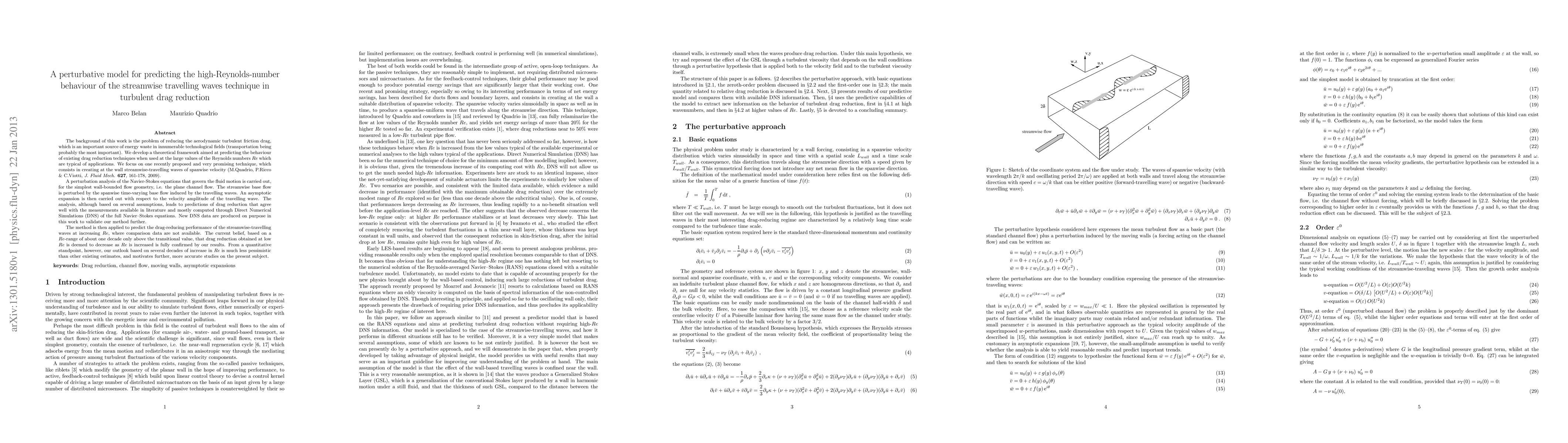 The background of this work is the problem of reducing the aerodynamic turbulent friction drag, which is an important source of energy waste in innumerable technological fields. We develop a theoretical framework aimed at predicting the behaviour of existing drag reduction techniques when used at the large values of Re which are typical of applications. We focus on one recently proposed and very promising technique, which consists in creating at the wall streamwise-travelling waves of spanwise velocity. A perturbation analysis of the Navier-Stokes equations that govern the fluid motion is carried out, for the simplest wall-bounded flow geometry, i.e. the plane channel flow. The streamwise base flow is perturbed by the spanwise time-varying base flow induced by the travelling waves. An asymptotic expansion is then carried out with respect to the velocity amplitude of the travelling wave. The analysis, although based on several assumptions, leads to predictions of drag reduction that agree well with the measurements available in literature and mostly computed through DNS of the full Navier-Stokes equations. New DNS data are produced on purpose in this work to validate our method further. The method is then applied to predict the drag-reducing performance of the streamwise-travelling waves at increasing Re, where comparison data are not available. The current belief, based on a Re-range of about one decade only above the transitional value, that drag reduction obtained at low Re is deemed to decrease as Re is increased is fully confirmed by our results. From a quantitative standpoint, however, our outlook based on several decades of increase in Re is much less pessimistic than other existing estimates, and motivates further, more accurate studies on the present subject.