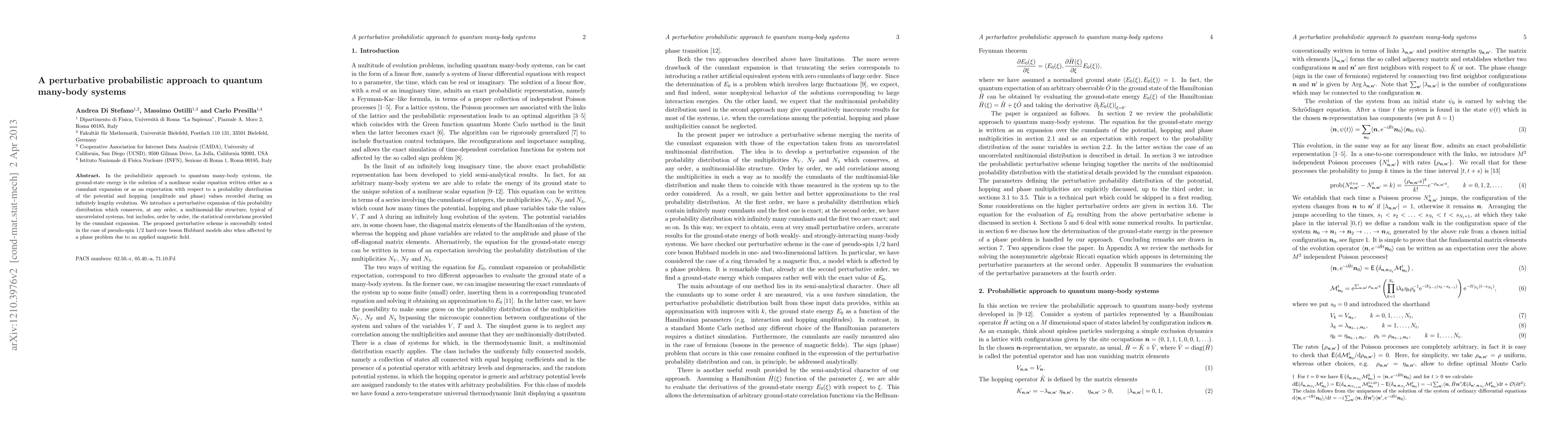 In the probabilistic approach to quantum many-body systems, the ground-state energy is the solution of a nonlinear scalar equation written either as a cumulant expansion or as an expectation with respect to a probability distribution of the potential and hopping (amplitude and phase) values recorded during an infinitely lengthy evolution. We introduce a perturbative expansion of this probability distribution which conserves, at any order, a multinomial-like structure, typical of uncorrelated systems, but includes, order by order, the statistical correlations provided by the cumulant expansion. The proposed perturbative scheme is successfully tested in the case of pseudo spin 1/2 hard-core boson Hubbard models also when affected by a phase problem due to an applied magnetic field.