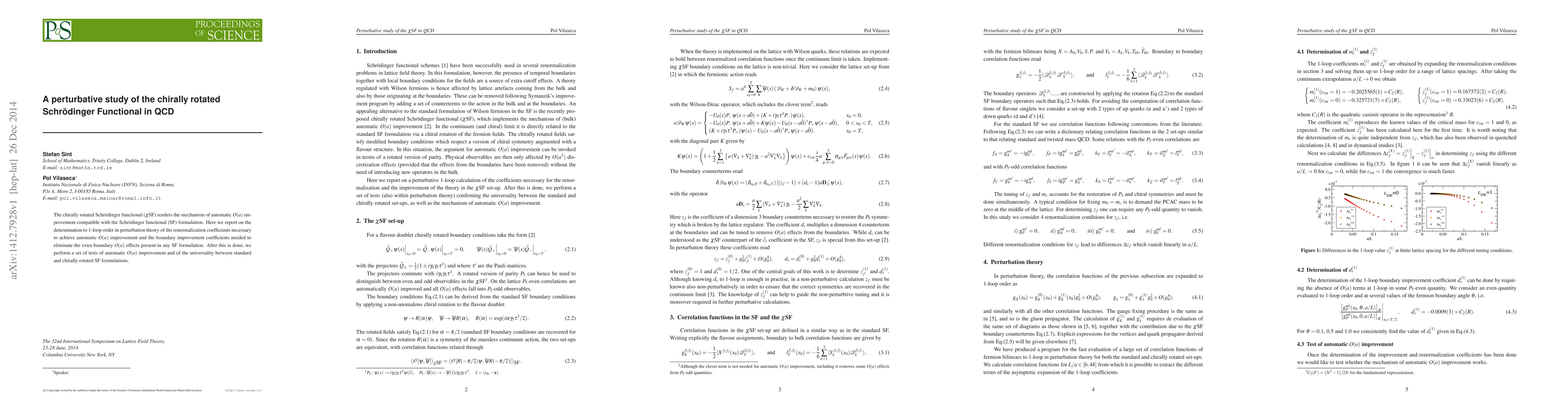 This paper determines 1-loop perturbative renormalization coefficients for the chirally rotated Schrödinger functional in QCD to achieve automatic $O(a)$ improvement and eliminates extra boundary $O(a)$ effects. Tests confirm the effectiveness of automatic $O(a)$ improvement and universality between standard and chirally rotated formulations.