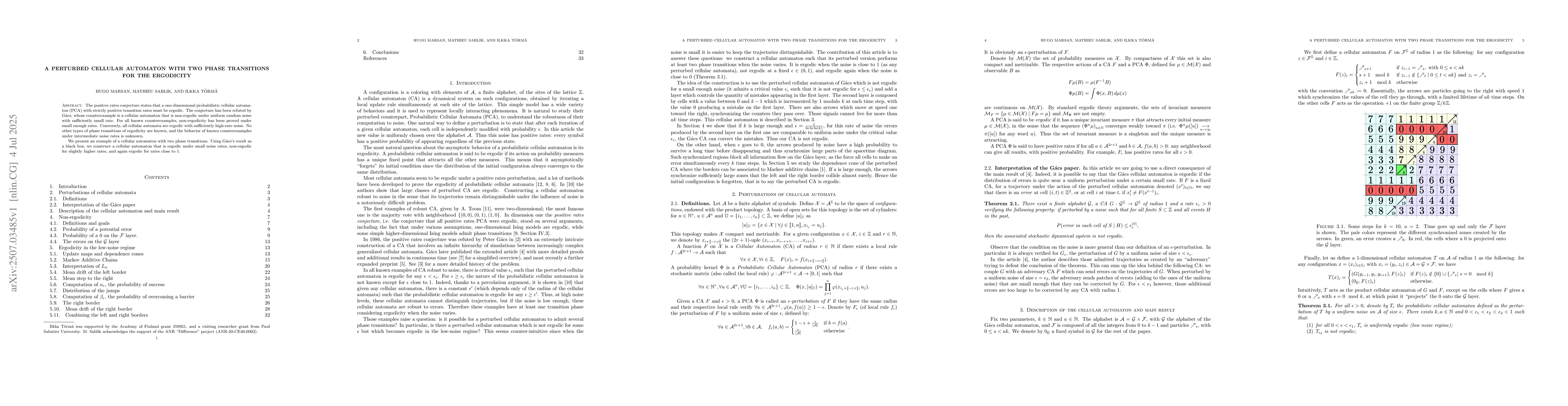 The positive rates conjecture states that a one-dimensional probabilistic cellular automaton (PCA) with strictly positive transition rates must be ergodic. The conjecture has been refuted by G\'acs, whose counterexample is a cellular automaton that is non-ergodic under uniform random noise with sufficiently small rate. For all known counterexamples, non-ergodicity has been proved under small enough rates. Conversely, all cellular automata are ergodic with sufficiently high-rate noise. No other types of phase transitions of ergodicity are known, and the behavior of known counterexamples under intermediate noise rates is unknown. We present an example of a cellular automaton with two phase transitions. Using G\'acs's result as a black box, we construct a cellular automaton that is ergodic under small noise rates, non-ergodic for slightly higher rates, and again ergodic for rates close to 1.