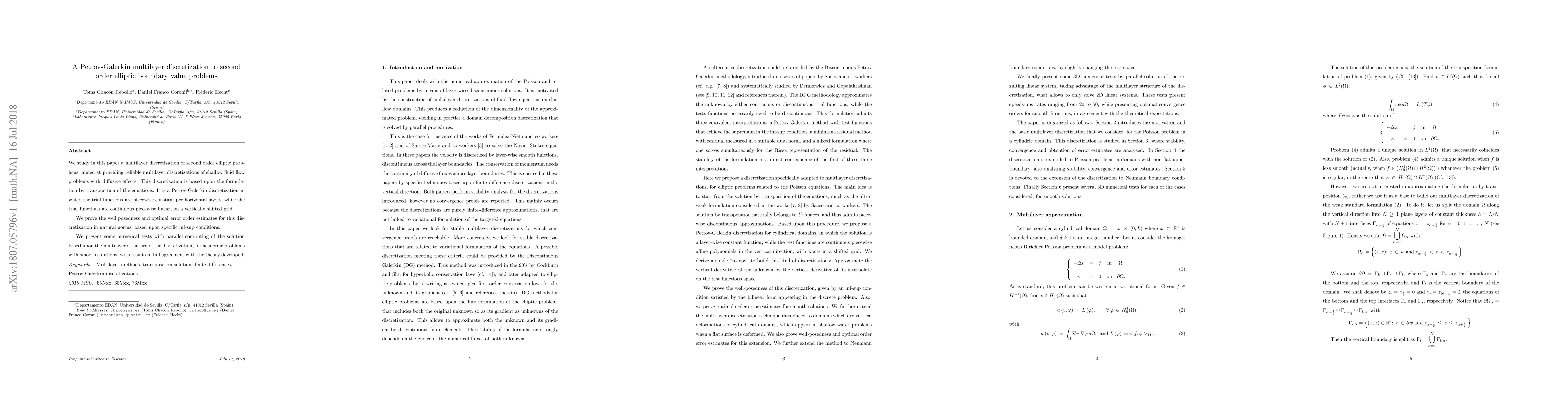 We study in this paper a multilayer discretization of second order elliptic problems, aimed at providing reliable multilayer discretizations of shallow fluid flow problems with diffusive effects. This discretization is based upon the formulation by transposition of the equations. It is a Petrov-Galerkin discretization in which the trial functions are piecewise constant per horizontal layers, while the trial functions are continuous piecewise linear, on a vertically shifted grid. We prove the well posedness and optimal error order estimates for this discretization in natural norms, based upon specific inf-sup conditions. We present some numerical tests with parallel computing of the solution based upon the multilayer structure of the discretization, for academic problems with smooth solutions, with results in full agreement with the theory developed.