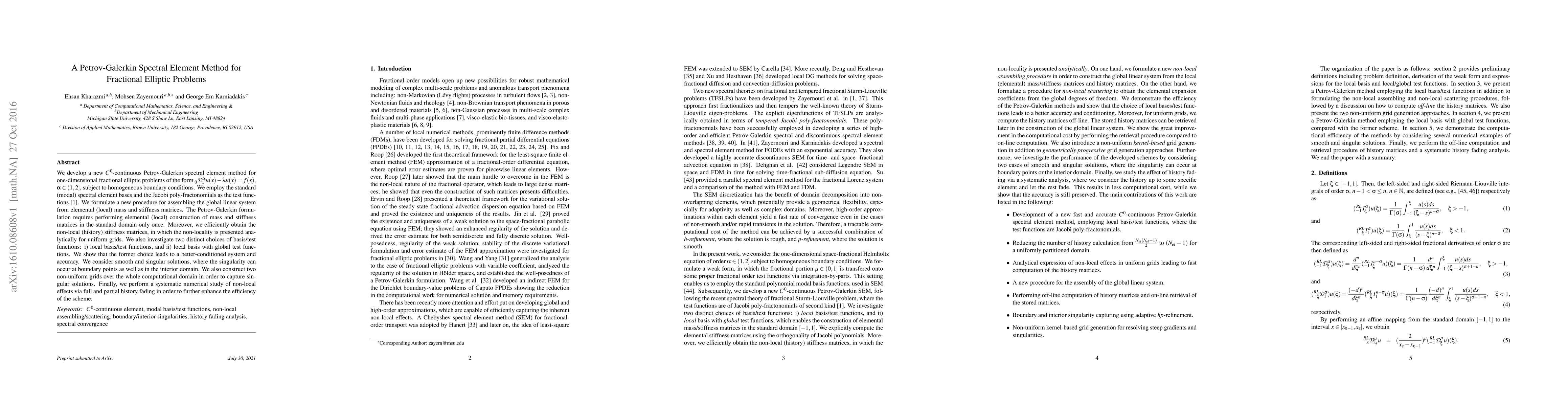 This paper introduces a new $C^{\,0}$-continuous Petrov-Galerkin spectral element method for solving one-dimensional fractional elliptic problems. The method employs Jacobi poly-fractonomials and standard spectral element bases, demonstrating improved conditioning and accuracy compared to alternative basis/test function choices.