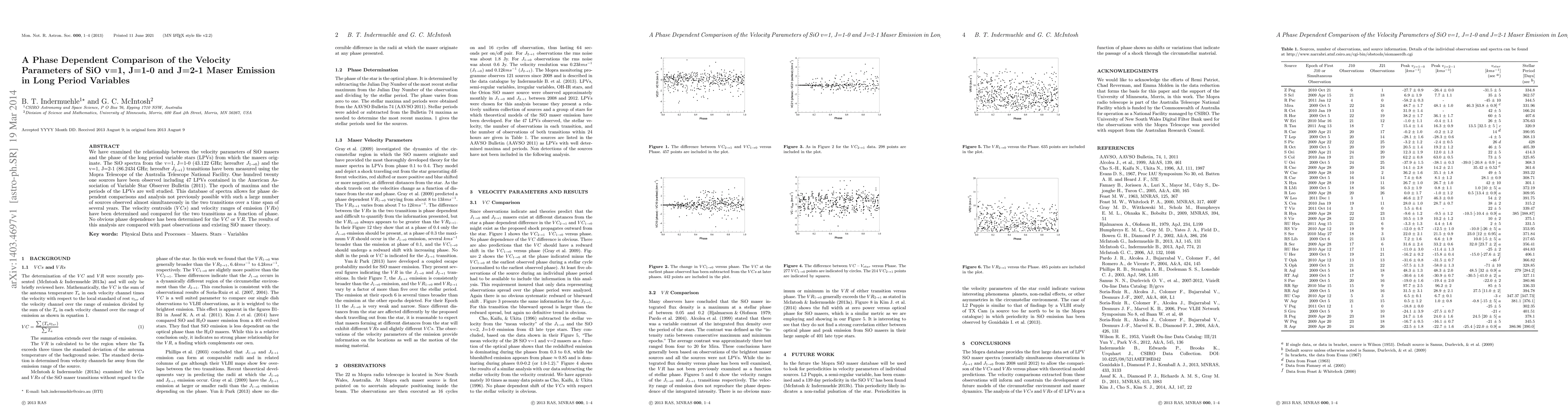 We have examined the relationship between the velocity parameters of SiO masers and the phase of the long period variable stars (LPVs) from which the masers originate. The SiO spectra from the v=1, J=1-0 (43.122 GHz; hereafter $J_{1\rightarrow0}$) and the v=1, J=2-1 (86.2434 GHz; hereafter $J_{2\rightarrow1}$) transitions have been measured using the Mopra Telescope of the Australia Telescope National Facility. One hundred twenty one sources have been observed including 47 LPVs contained in the American Association of Variable Star Observer Bulletin (2011). The epoch of maxima and the periods of the LPVs are well studied. This database of spectra allows for phase dependent comparisons and analysis not previously possible with such a large number of sources observed almost simultaneously in the two transitions over a time span of several years. The velocity centroids ($VCs$) and velocity ranges of emission ($VRs$) have been determined and compared for the two transitions as a function of phase. No obvious phase dependence has been determined for the $VC$ or $VR$. The results of this analysis are compared with past observations and existing SiO maser theory.
