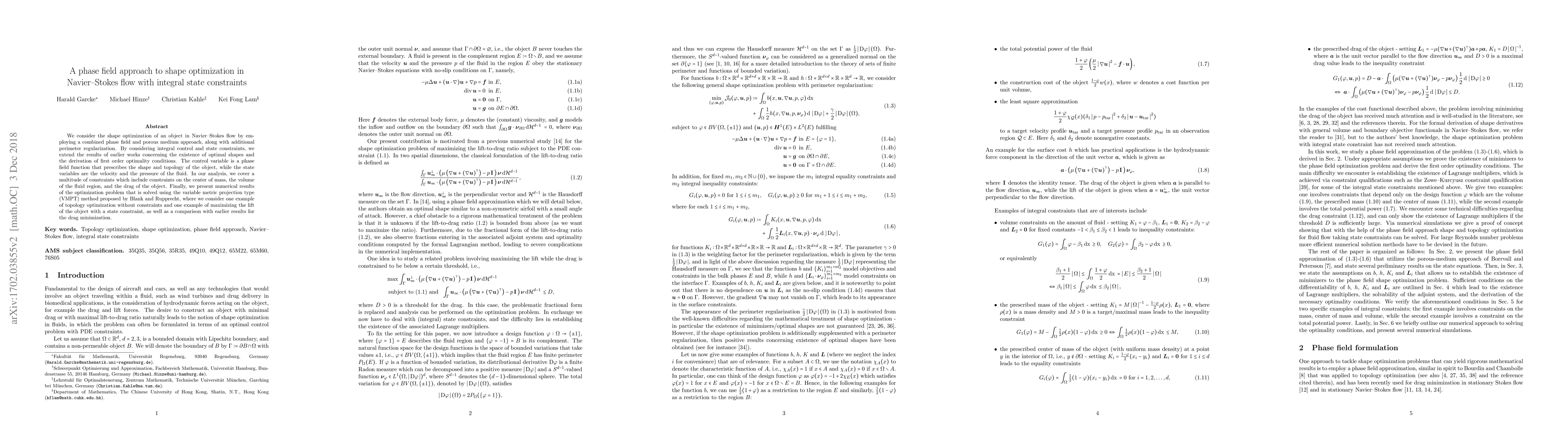 This paper employs a phase field approach combined with a porous medium method for shape optimization in Navier-Stokes flow, incorporating integral state constraints and perimeter regularization. The study extends previous results on optimal shapes and derives first-order optimality conditions, presenting numerical results using the VMPT method for examples of topology optimization and lift maximization.