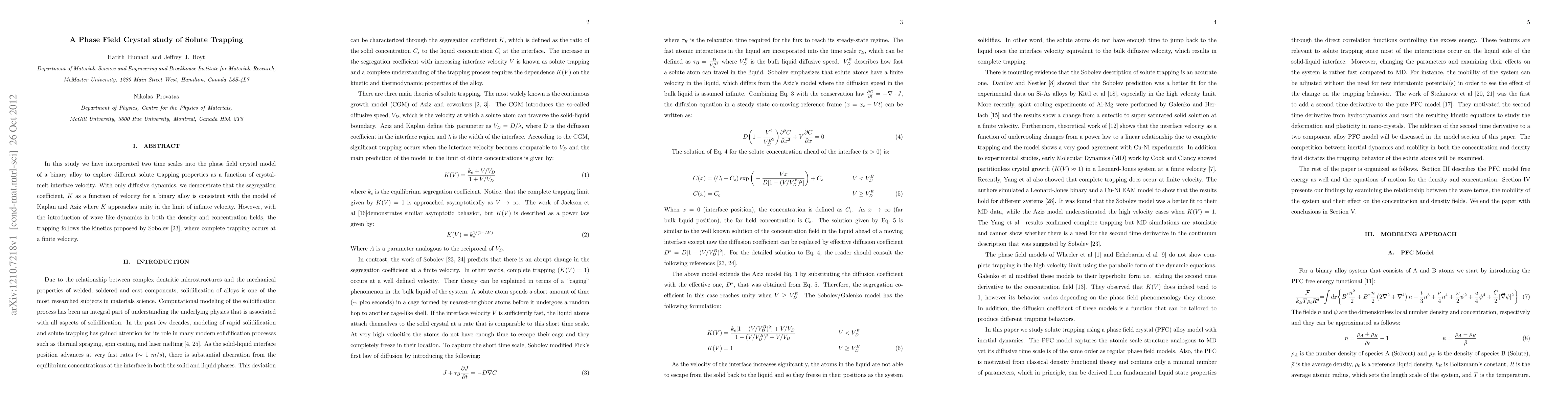 This research uses a modified phase field crystal model to study solute trapping in binary alloys, incorporating two time scales for crystal-melt interface velocity. It finds that while diffusive dynamics follow Kaplan and Aziz's model, introducing wave-like dynamics results in complete trapping at a finite velocity, as proposed by Sobolev.