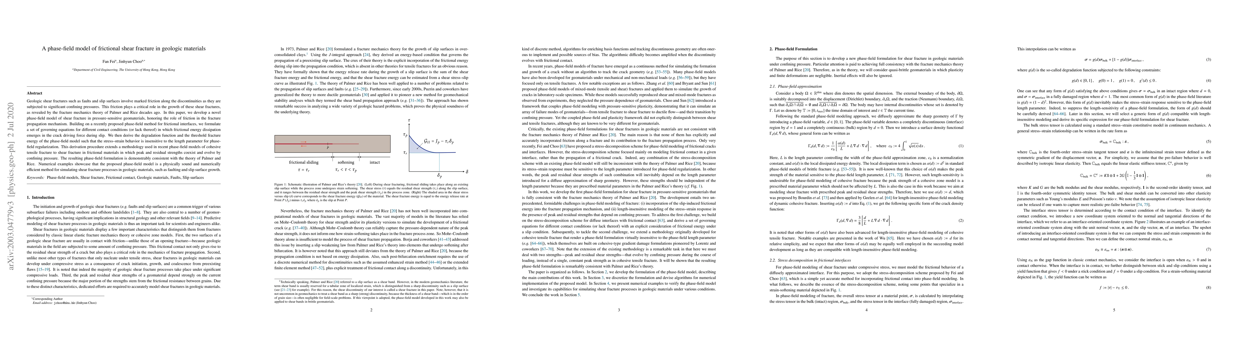 This paper develops a phase-field model for simulating frictional shear fracture in geologic materials, incorporating frictional energy dissipation into the fracture propagation mechanism. The model is consistent with Palmer and Rice's fracture mechanics theory and demonstrates physical soundness and numerical efficiency in simulating faulting and slip surface growth.