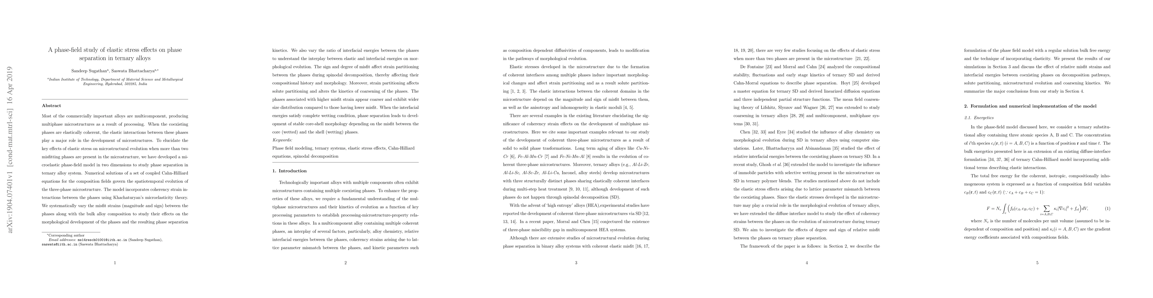 The development of a microelastic phase-field model that incorporates coherency strain interactions to study phase separation in ternary alloys under elastic stress.