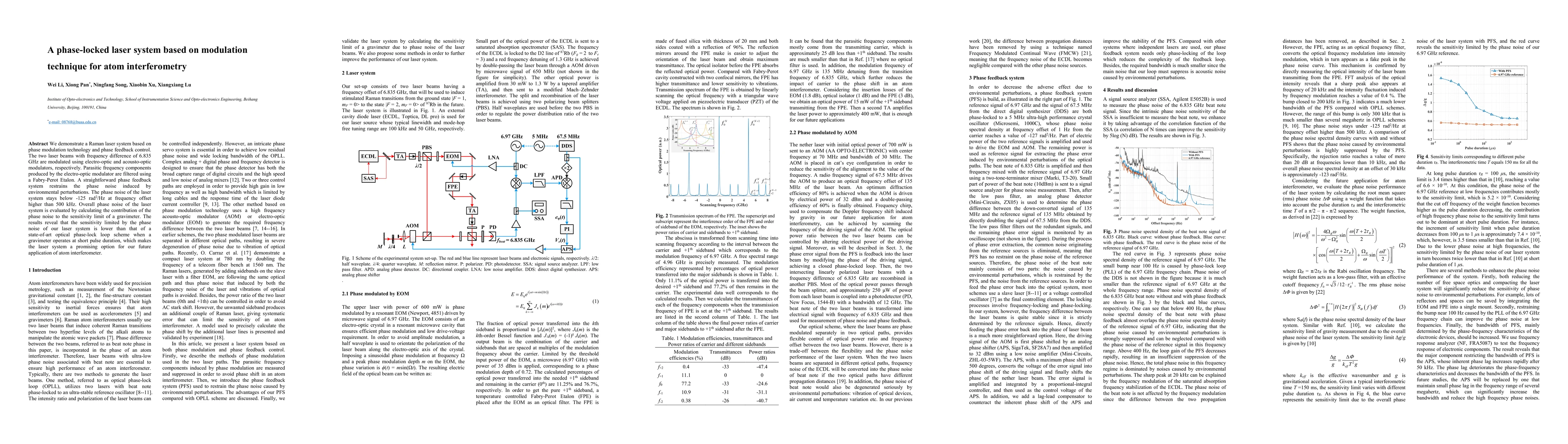 We demonstrate a Raman laser system based on phase modulation technology and phase feedback control. The two laser beams with frequency difference of 6.835 GHz are modulated using electro-optic and acousto-optic modulators, respectively. Parasitic frequency components produced by the electro-optic modulator are filtered using a Fabry-Perot Etalon. A straightforward phase feedback system restrains the phase noise induced by environmental perturbations. The phase noise of the laser system stays below -125 rad2/Hz at frequency offset higher than 500 kHz. Overall phase noise of the laser system is evaluated by calculating the contribution of the phase noise to the sensitivity limit of a gravimeter. The results reveal that the sensitivity limited by the phase noise of our laser system is lower than that of a state-of-art optical phase-lock loop scheme when a gravimeter operates at short pulse duration, which makes the laser system a promising option for our future application of atom interferometer.