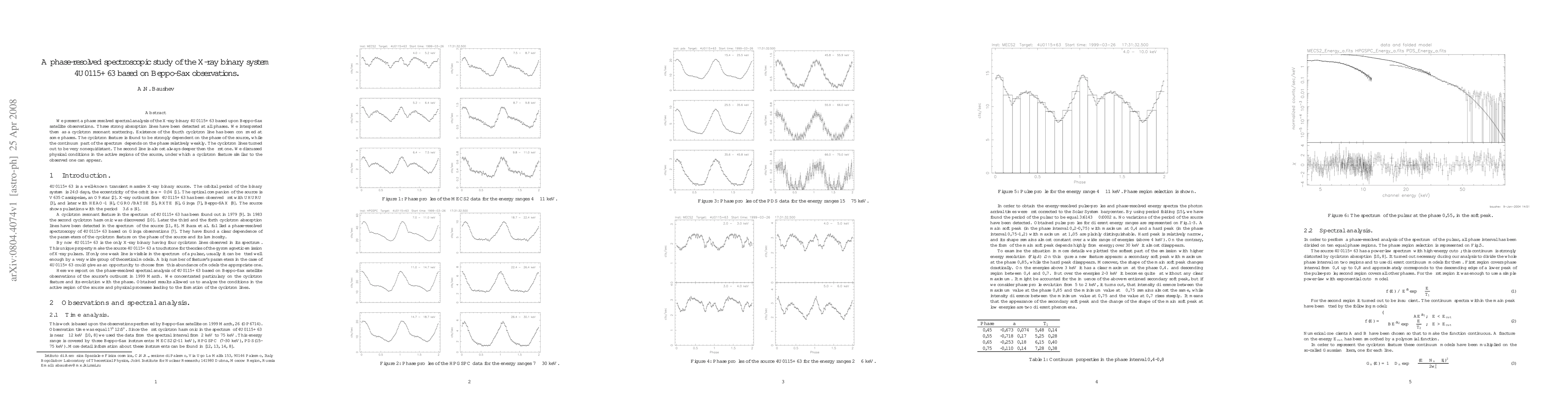 We present a phase resolved spectral analysis of the X-ray binary 4U0115+63 based upon Beppo-Sax satellite observations. Three strong absorption lines have been detected at all phases. We interpreted them as a cyclotron resonant scattering. Existence of the fourth cyclotron line has been confirmed at some phases. The cyclotron feature is found to be strongly dependent on the phase of the source, while the continuum part of the spectrum depends on the phase relatively weakly. The cyclotron lines turned out to be very nonequidistant. The second line is almost always deeper then the first one. We discussed physical conditions in the active regions of the source, under which a cyclotron feature similar to the observed one can appear.