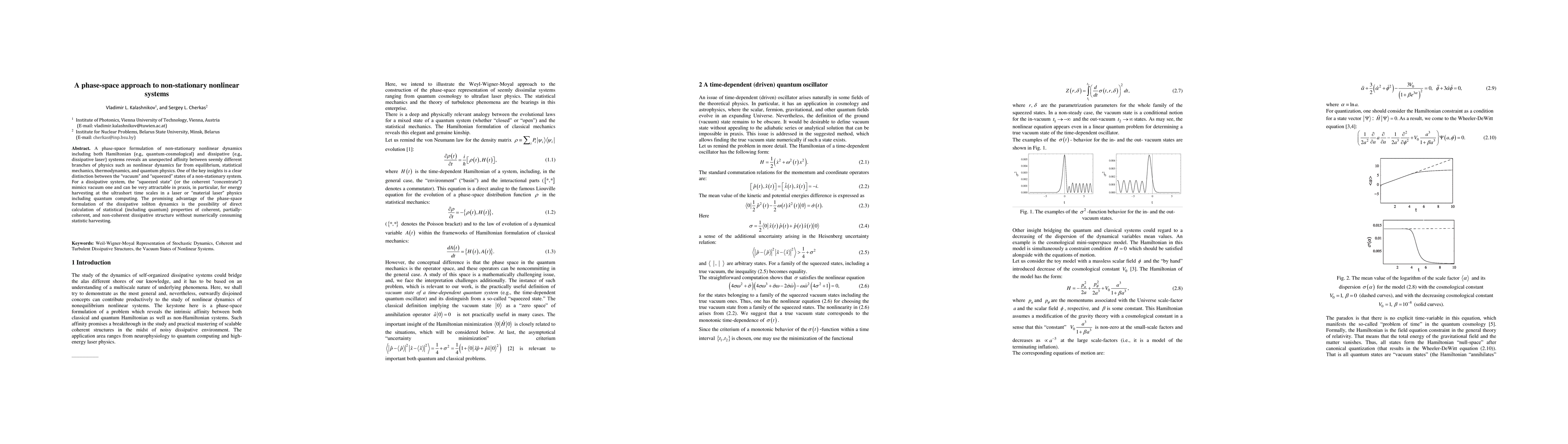 A phase-space formulation of non-stationary nonlinear dynamics including both Hamiltonian (e.g., quantum-cosmological) and dissipative (e.g., dissipative laser) systems reveals an unexpected affinity between seemly different branches of physics such as nonlinear dynamics far from equilibrium, statistical mechanics, thermodynamics, and quantum physics. One of the key insights is a clear distinction between the "vacuum" and "squeezed" states of a non-stationary system. For a dissipative system, the "squeezed state" (or the coherent "concentrate") mimics vacuum one and can be very attractable in praxis, in particular, for energy harvesting at the ultrashort time scales in a laser or "material laser" physics including quantum computing. The promising advantage of the phase-space formulation of the dissipative soliton dynamics is the possibility of direct calculation of statistical (including quantum) properties of coherent, partially-coherent, and non-coherent dissipative structure without numerically consuming statistic harvesting.