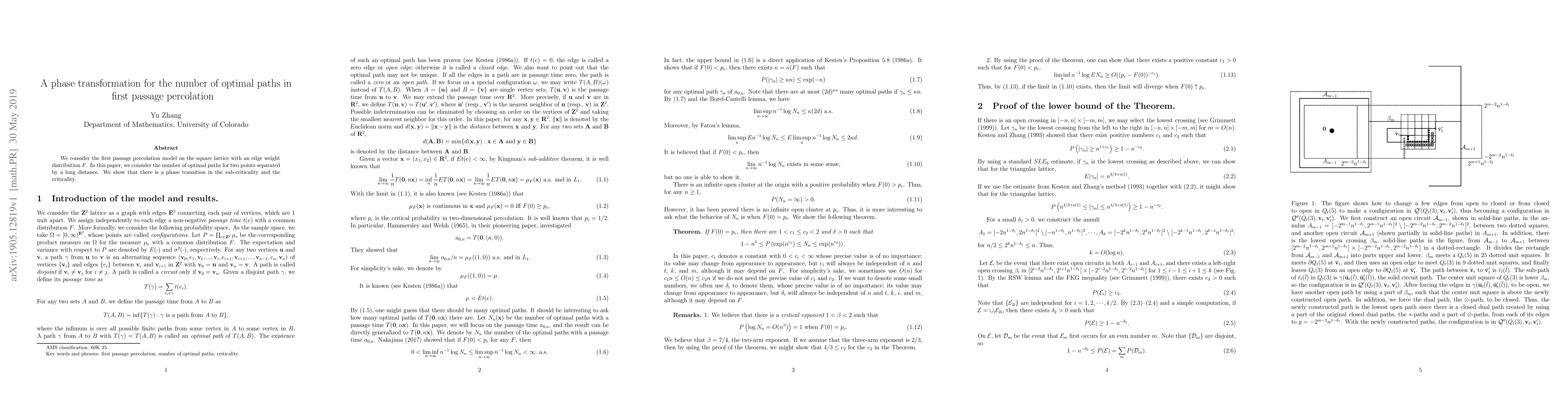 Summary: This paper investigates the first passage percolation model on the square lattice, demonstrating a phase transition in the number of optimal paths between two distant points, distinguishing between sub-critical and critical edge weight distributions.