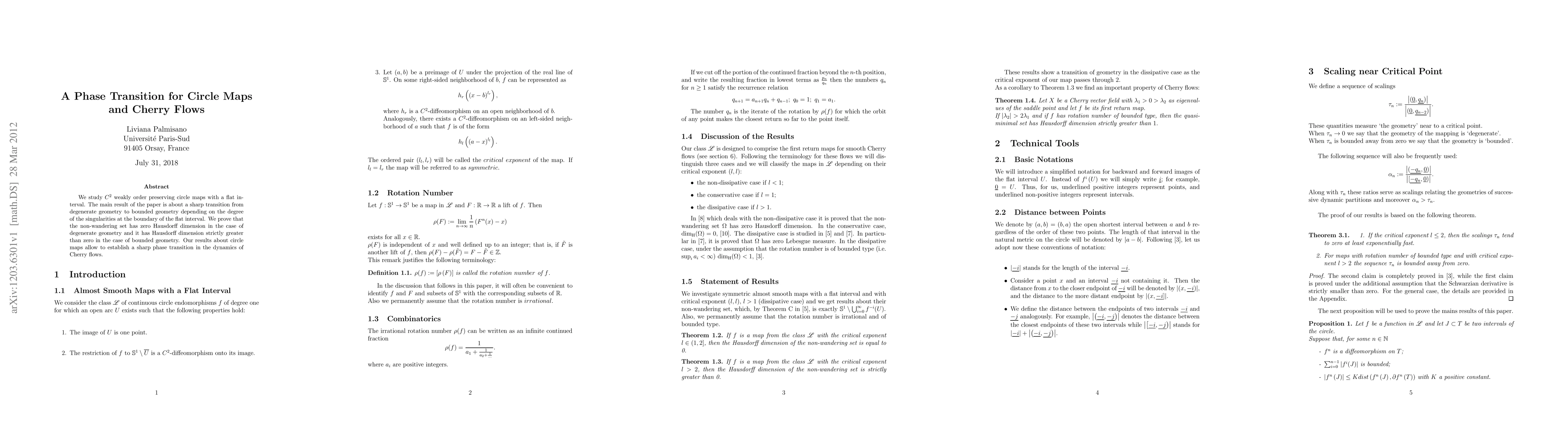 We study $C^{2}$ weakly order preserving circle maps with a flat interval. The main result of the paper is about a sharp transition from degenerate geometry to bounded geometry depending on the degree of the singularities at the boundary of the flat interval. We prove that the non-wandering set has zero Hausdorff dimension in the case of degenerate geometry and it has Hausdorff dimension strictly greater than zero in the case of bounded geometry. Our results about circle maps allow to establish a sharp phase transition in the dynamics of Cherry flows.