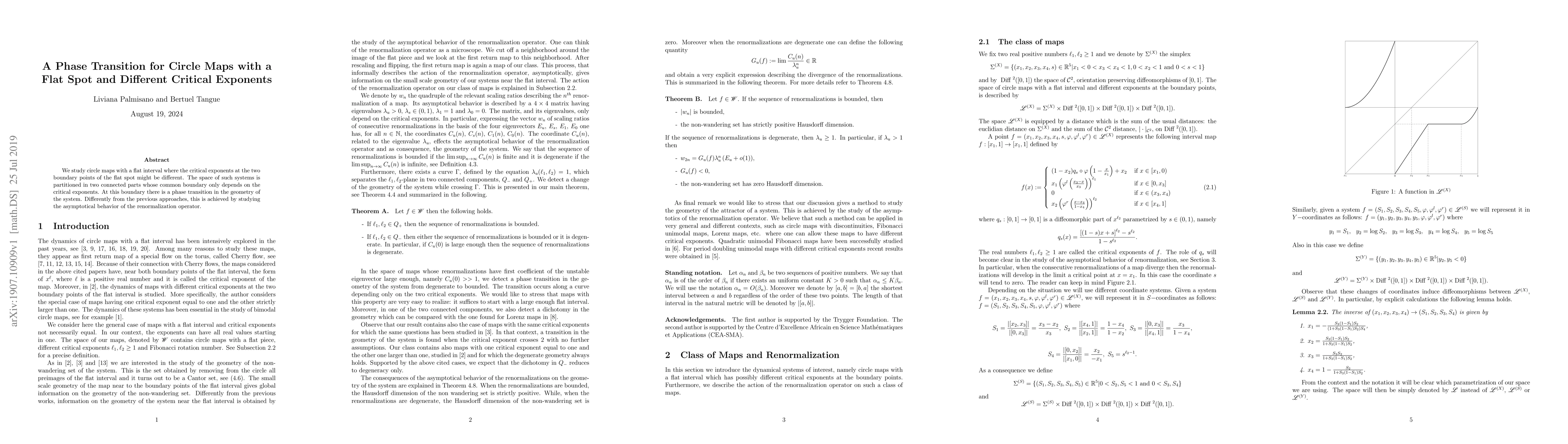 We study circle maps with a flat interval where the critical exponents at the two boundary points of the flat spot might be different. The space of such systems is partitioned in two connected parts whose common boundary only depends on the critical exponents. At this boundary there is a phase transition in the geometry of the system. Differently from the previous approaches, this is achieved by studying the asymptotical behavior of the renormalization operator.
