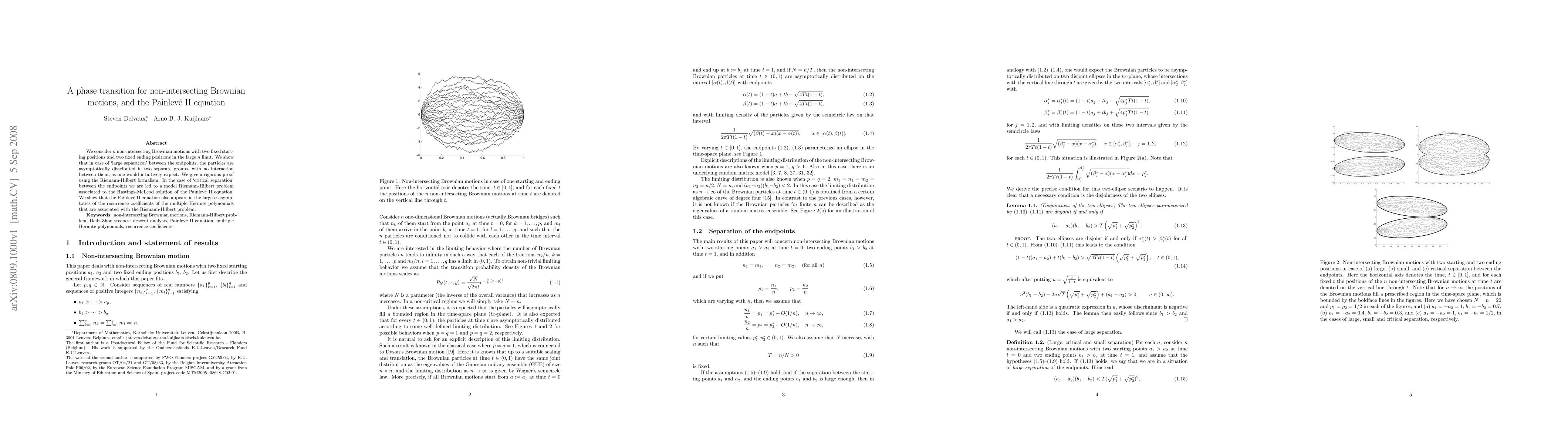 This paper investigates the asymptotic behavior of n non-intersecting Brownian motions under large separation and critical separation conditions between endpoints, revealing a phase transition. The critical separation case connects to the Painlevé II equation through a Riemann-Hilbert problem and recurrence coefficients of multiple Hermite polynomials.