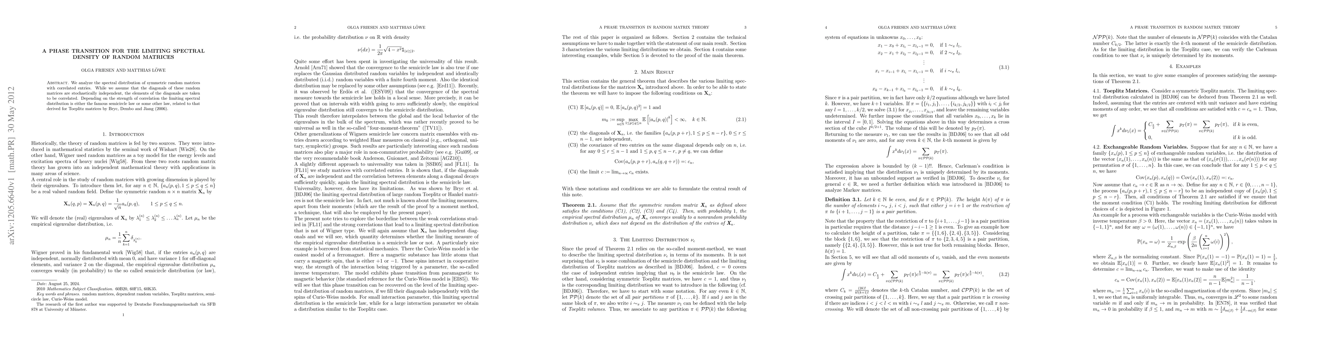We analyze the spectral distribution of symmetric random matrices with correlated entries. While we assume that the diagonals of these random matrices are stochastically independent, the elements of the diagonals are taken to be correlated. Depending on the strength of correlation the limiting spectral distribution is either the famous semicircle law or some other law, related to that derived for Toeplitz matrices by Bryc, Dembo and Jiang (2006).