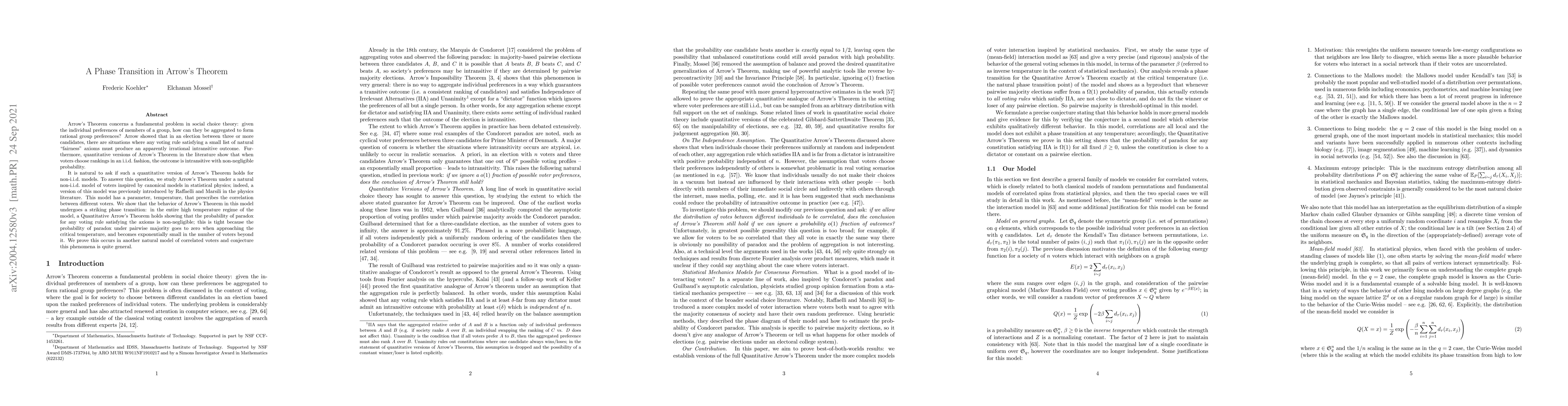 Arrow's Theorem concerns a fundamental problem in social choice theory: given the individual preferences of members of a group, how can they be aggregated to form rational group preferences? Arrow showed that in an election between three or more candidates, there are situations where any voting rule satisfying a small list of natural "fairness" axioms must produce an apparently irrational intransitive outcome. Furthermore, quantitative versions of Arrow's Theorem in the literature show that when voters choose rankings in an i.i.d.\ fashion, the outcome is intransitive with non-negligible probability. It is natural to ask if such a quantitative version of Arrow's Theorem holds for non-i.i.d.\ models. To answer this question, we study Arrow's Theorem under a natural non-i.i.d.\ model of voters inspired by canonical models in statistical physics; indeed, a version of this model was previously introduced by Raffaelli and Marsili in the physics literature. This model has a parameter, temperature, that prescribes the correlation between different voters. We show that the behavior of Arrow's Theorem in this model undergoes a striking phase transition: in the entire high temperature regime of the model, a Quantitative Arrow's Theorem holds showing that the probability of paradox for any voting rule satisfying the axioms is non-negligible; this is tight because the probability of paradox under pairwise majority goes to zero when approaching the critical temperature, and becomes exponentially small in the number of voters beyond it. We prove this occurs in another natural model of correlated voters and conjecture this phenomena is quite general.