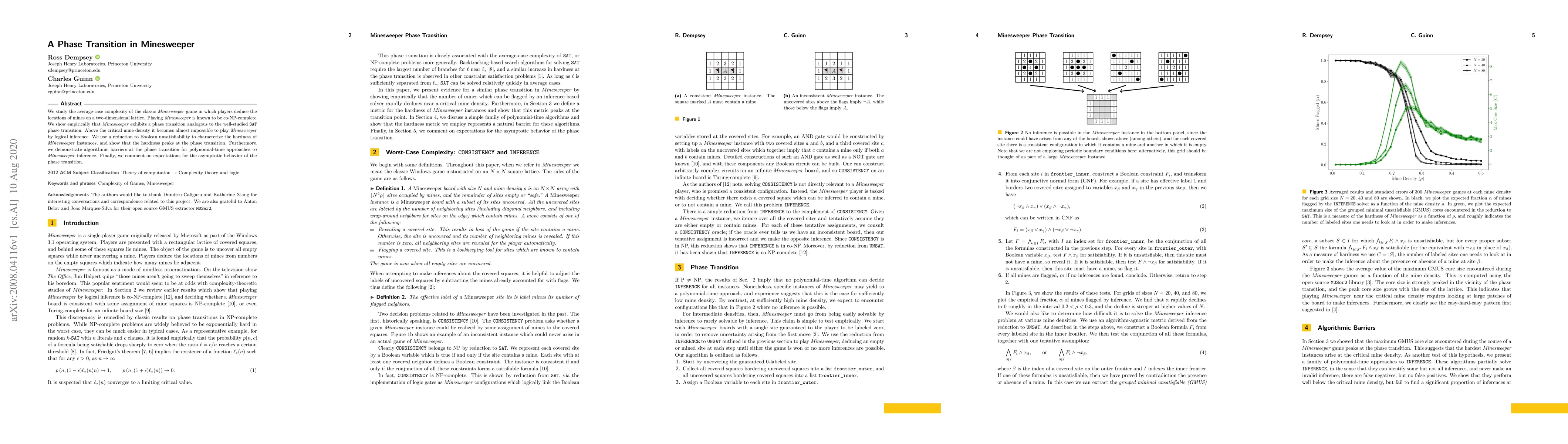 This paper investigates the average-case complexity of Minesweeper, demonstrating a phase transition analogous to SAT, where above a critical mine density logical inference becomes nearly impossible. The study shows that Minesweeper's difficulty peaks at this transition, presenting algorithmic barriers for polynomial-time solutions.