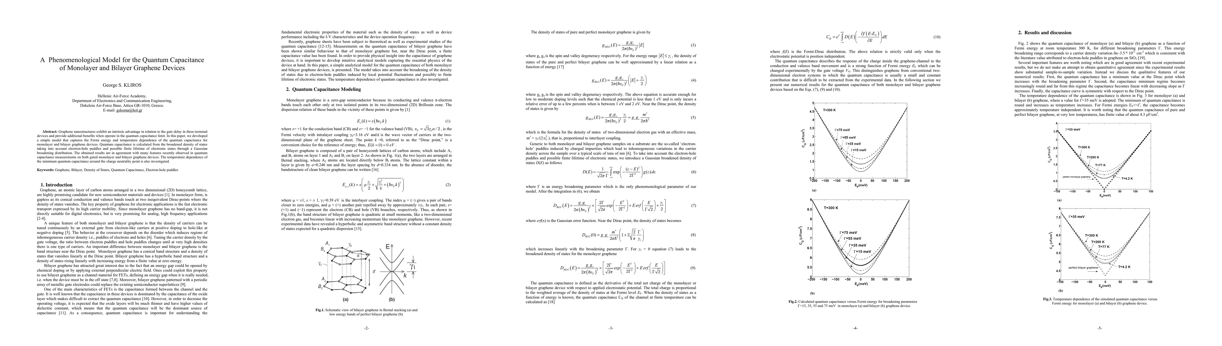 This paper develops a phenomenological model to describe the quantum capacitance in graphene devices, accounting for Fermi energy and temperature effects. The model captures quantum capacitance based on a broadened density of states, aligning with recent experimental observations in monolayer and bilayer graphene devices.
