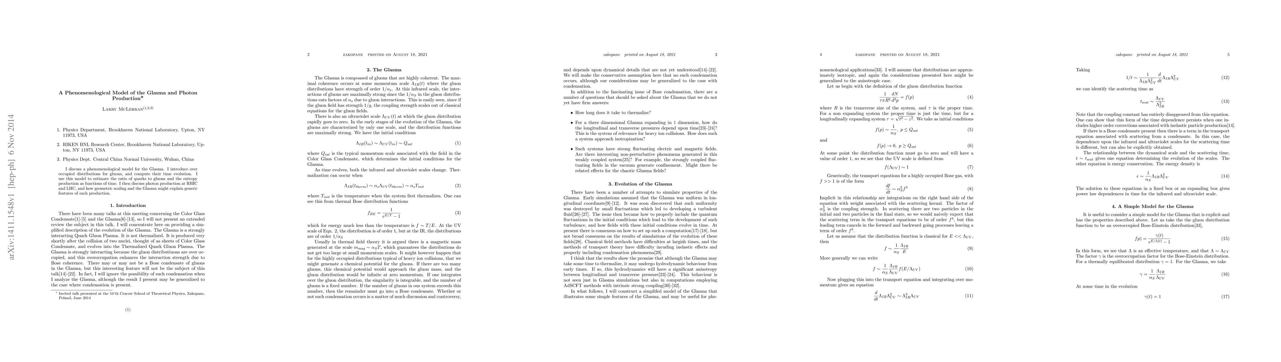 This paper presents a phenomenological model for the Glasma, introducing over-occupied gluon distributions and their time evolution. It estimates quark-gluon ratios and entropy production over time, and discusses photon production at RHIC and LHC, linking geometric scaling and the Glasma to observed features.