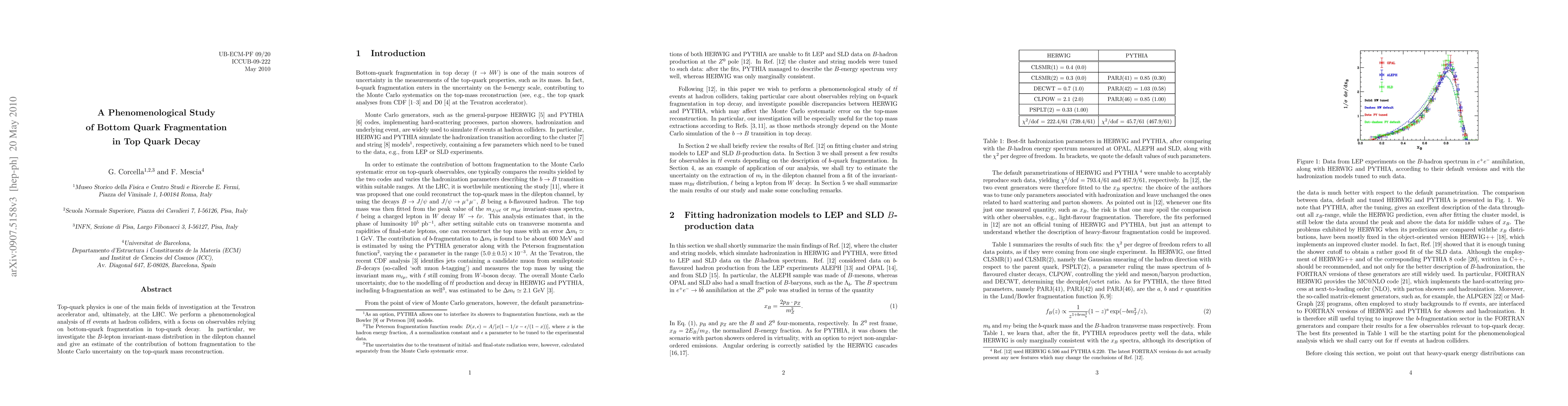 Top-quark physics is one of the main fields of investigation at the Tevatron accelerator and, ultimately, at the LHC. We perform a phenomenological analysis of ttbar events at hadron colliders, with a focus on observables relying on bottom-quark fragmentation in top-quark decay. In particular, we investigate the B-lepton invariant-mass distribution in the dilepton channel and give an estimate of the contribution of bottom fragmentation to the Monte Carlo uncertainty on the top-quark mass reconstruction.