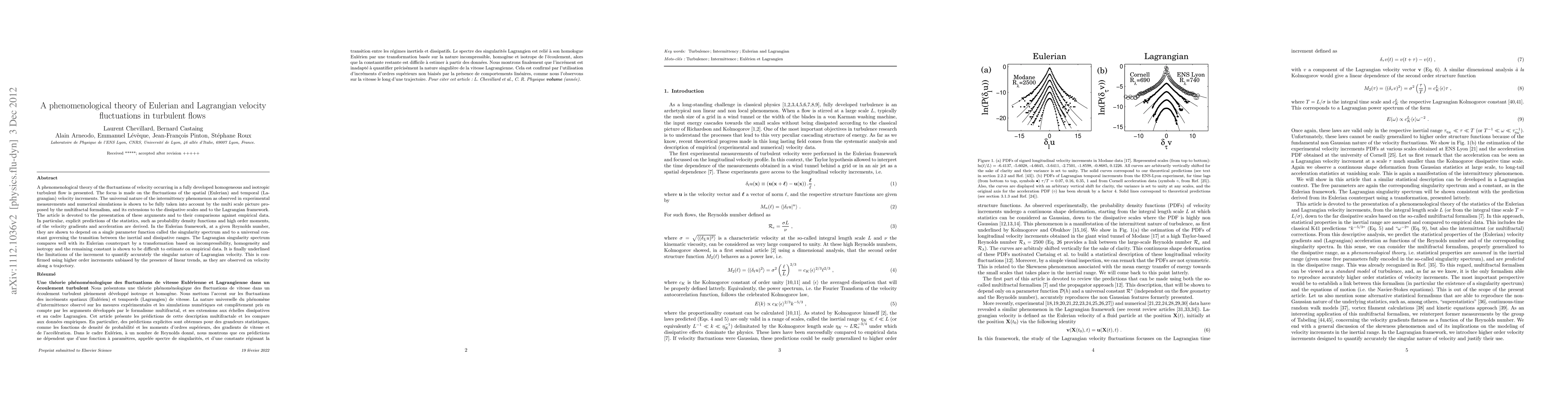 This paper develops a phenomenological theory for velocity fluctuations in turbulent flows, focusing on Eulerian and Lagrangian velocity increments. It uses multifractal formalism to account for intermittency and compares theoretical predictions with empirical data, showing the singularity spectrum's role in describing velocity gradients and acceleration.