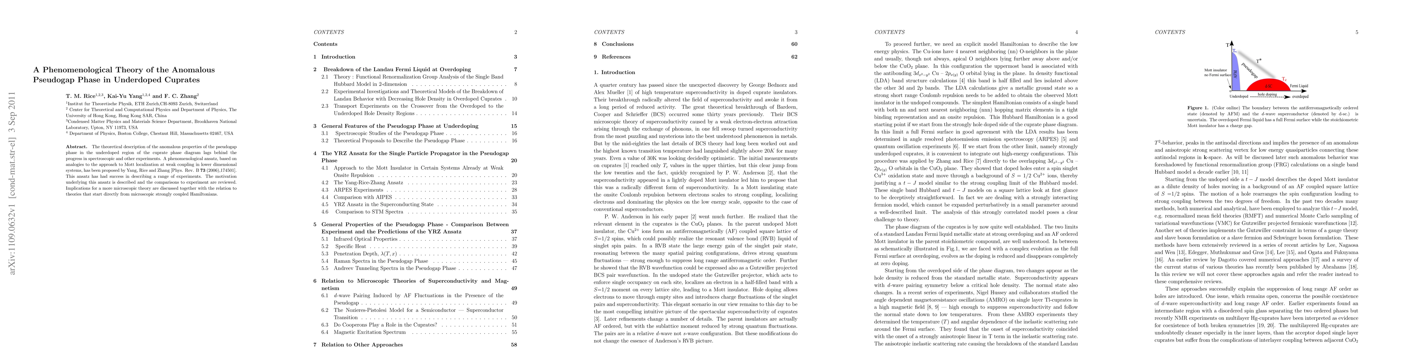The paper discusses a phenomenological theory for the pseudogap phase in underdoped cuprates, drawing from analogies to weak coupling Mott localization in lower dimensions. This theory, proposed by Yang, Rice, and Zhang, successfully explains various experimental results and serves as a foundation for developing a more comprehensive microscopic theory, while also connecting to theories based on strongly coupled Hamiltonians.