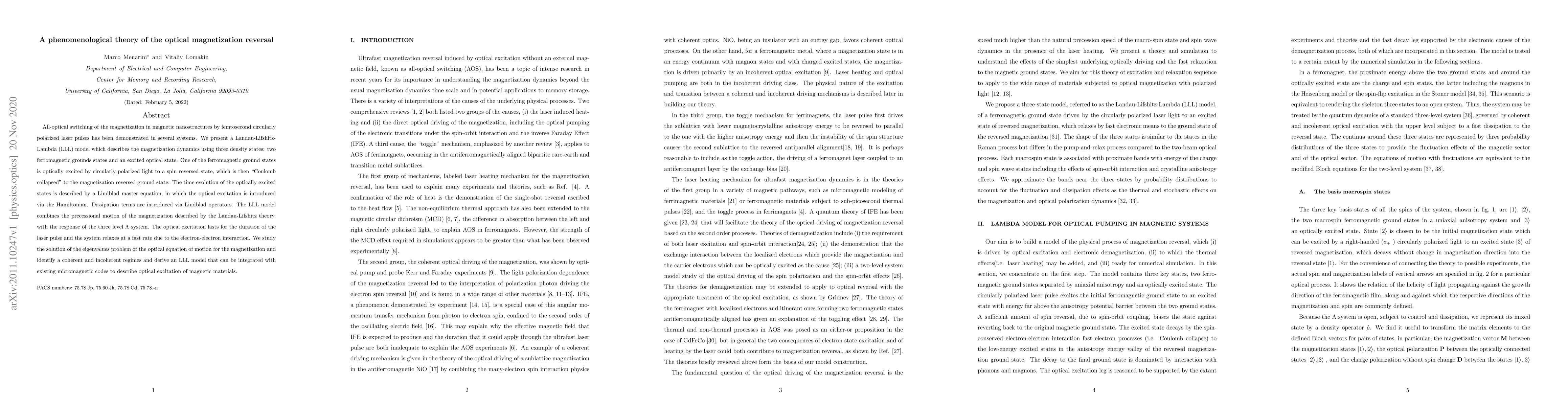 The paper introduces a Landau-Lifshitz-Lambda (LLL) model to describe magnetization dynamics in magnetic nanostructures under femtosecond circularly polarized laser pulses. The model combines magnetization precession with a three-level Lambda system, explaining optical magnetization reversal. It uses a Lindblad master equation to depict excitation and relaxation processes, offering a framework integrable with micromagnetic codes for optical excitation studies in magnetic materials.