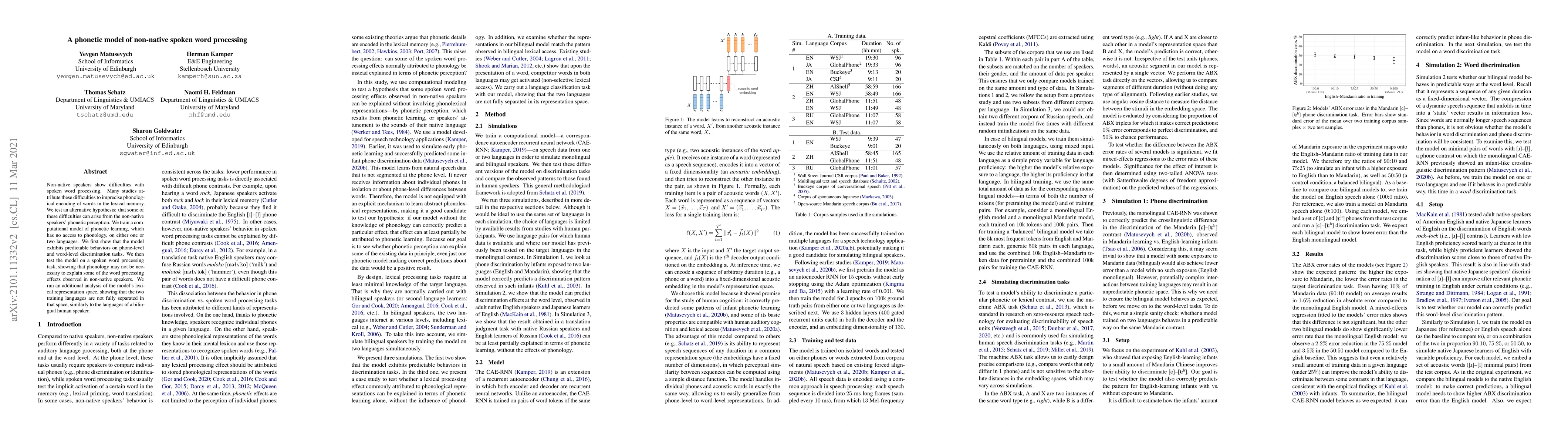 This paper investigates whether non-native spoken word processing difficulties stem from phonetic perception rather than phonological encoding. A computational phonetic model trained on one or two languages demonstrates that phonology may not be necessary to explain some processing effects, and its lexical representation space shows incomplete language separation akin to bilingual human speakers.