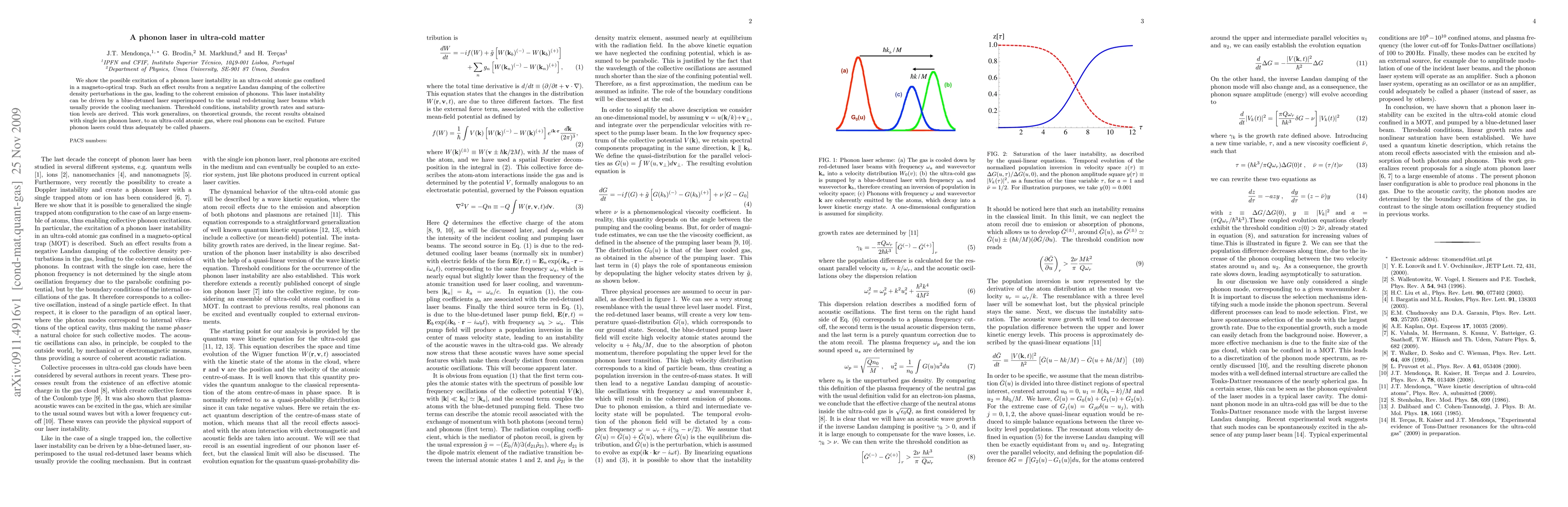 We show the possible excitation of a phonon laser instability in an ultra-cold atomic gas confined in a magneto-optical trap. Such an effect results from a negative Landau damping of the collective density perturbations in the gas, leading to the coherent emission of phonons. This laser instability can be driven by a blue-detuned laser superimposed to the usual red-detuning laser beams which usually provide the cooling mechanism. Threshold conditions, instability growth rates and saturation levels are derived. This work generalizes, on theoretical grounds, the recent results obtained with single ion phonon laser, to an ultra-cold atomic gas, where real phonons can be excited. Future phonon lasers could thus adequately be called phasers.