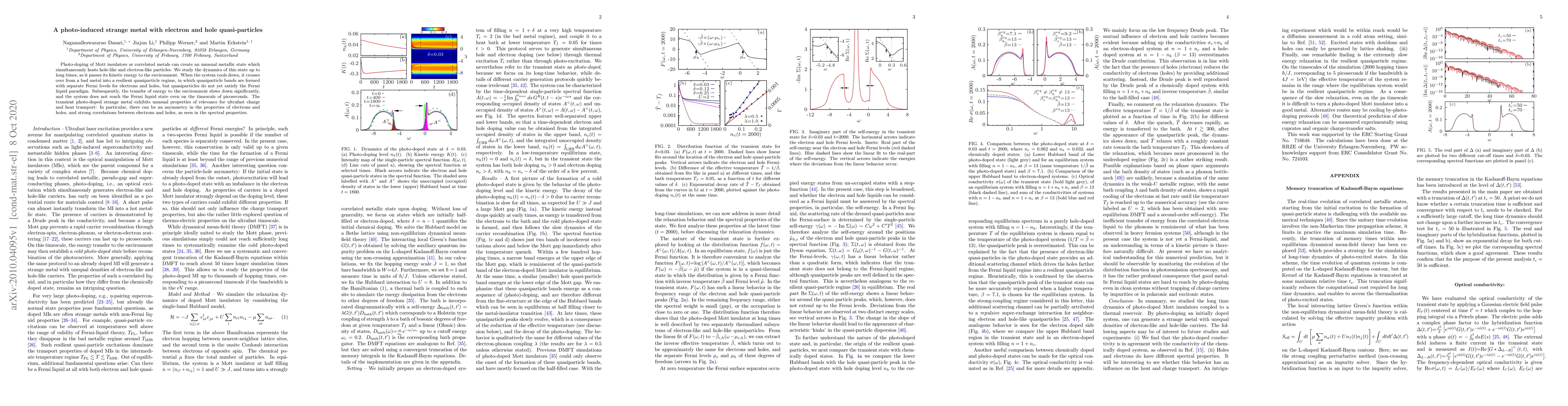 Photo-doping of Mott insulators or correlated metals can create an unusual metallic state which simultaneously hosts hole-like and electron-like particles. We study the dynamics of this state up to long times, as it passes its kinetic energy to the environment. When the system cools down, it crosses over from a bad metal into a resilient quasiparticle regime, in which quasiparticle bands are formed with separate Fermi levels for electrons and holes, but quasiparticles do not yet satisfy the Fermi liquid paradigm. Subsequently, the transfer of energy to the environment slows down significantly, and the system does not reach the Fermi liquid state even on the timescale of picoseconds. The transient photo-doped strange metal exhibits unusual properties of relevance for ultrafast charge and heat transport: In particular, there can be an asymmetry in the properties of electrons and holes, and strong correlations between electrons and holes, as seen in the spectral properties.