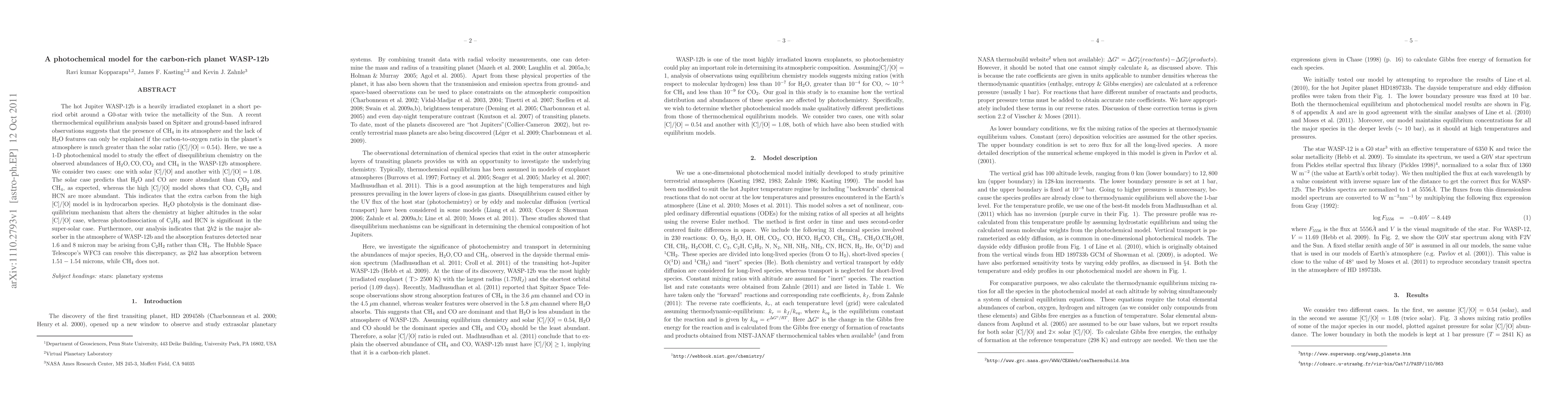 This paper develops a 1-D photochemical model to investigate the atmospheric chemistry of the carbon-rich exoplanet WASP-12b, finding that high carbon-to-oxygen ratios lead to increased abundances of hydrocarbons like C₂H₂ and HCN, potentially resolving discrepancies in observed spectral features.