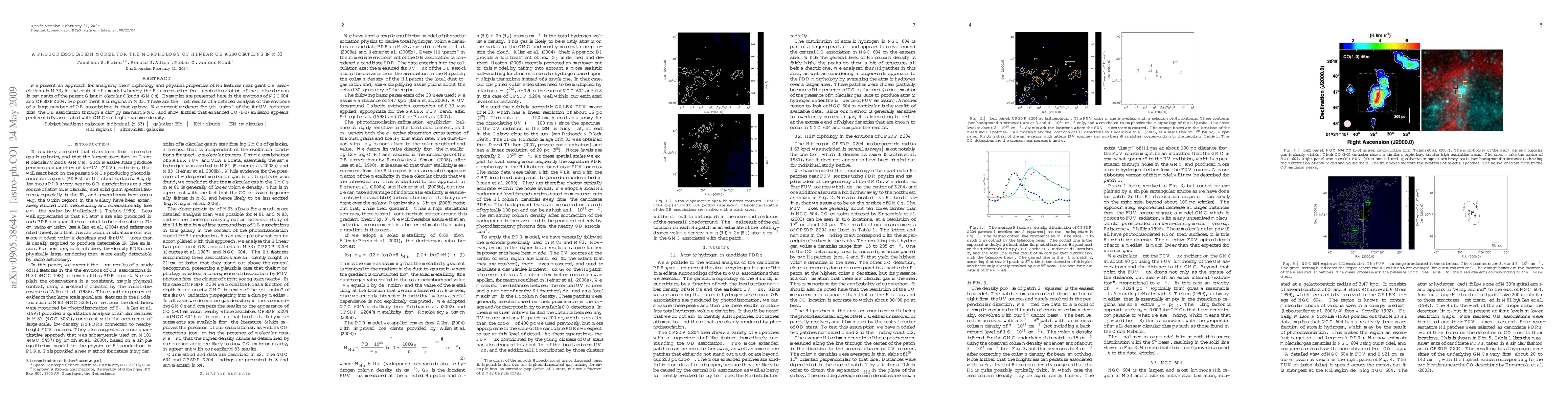 This paper develops a photodissociation model to analyze HI morphology near OB associations in M33, suggesting the HI excess results from molecular gas photodissociation in remnant GMCs. Initial findings around NGC604 and CPSDPZ204 show evidence of far-UV radiation diffusion through clumpy GMCs, with enhanced CO(1-0) emission linked to denser GMCs.