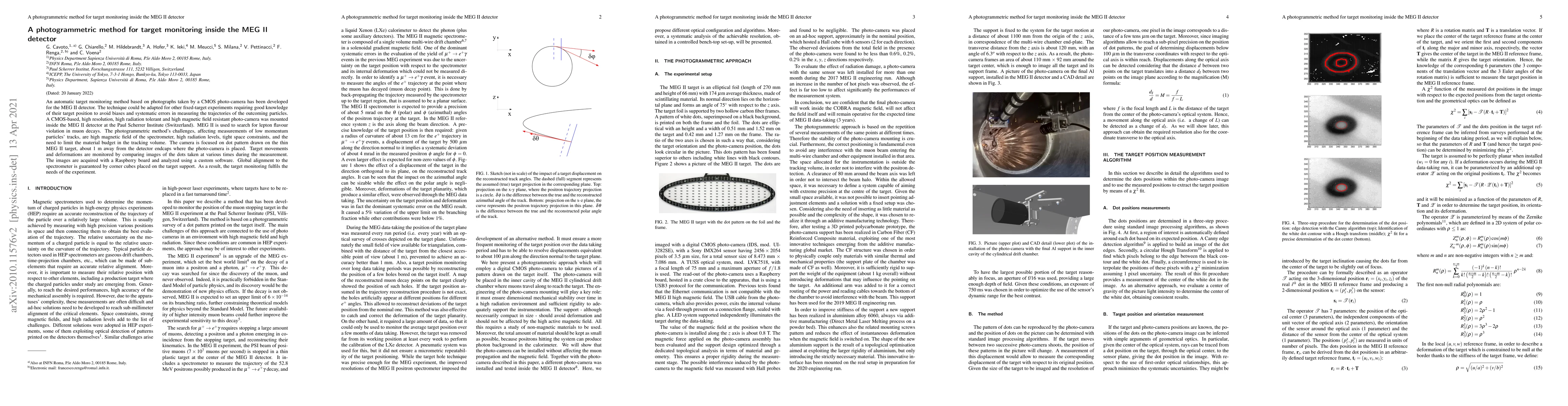 A photogrammetric method uses a CMOS camera to monitor target movements in the MEG II detector, ensuring accurate measurements despite high magnetic fields, radiation, and space constraints.