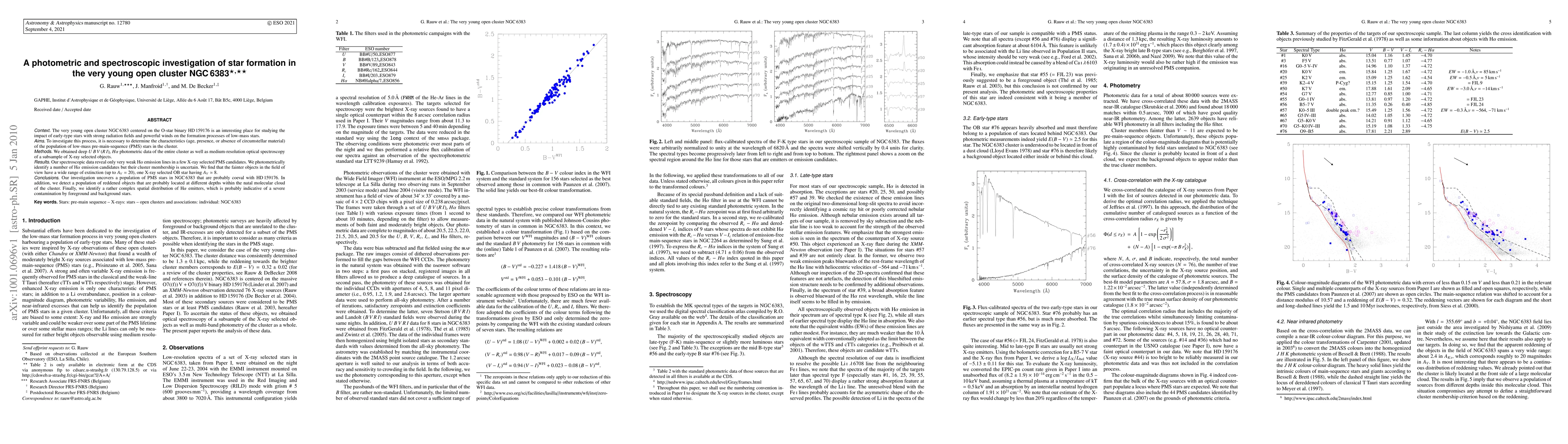The very young open cluster NGC 6383 centered on the O-star binary HD 159176 is an interesting place for studying the impact of early-type stars with strong radiation fields and powerful winds on the formation processes of low-mass stars. To investigate this process, it is necessary to determine the characteristics (age, presence, or absence of circumstellar material) of the population of low-mass pre-main-sequence (PMS) stars in the cluster. We obtained deep U B V (R I)_c H-alpha photometric data of the entire cluster as well as medium-resolution optical spectroscopy of a subsample of X-ray selected objects. Our spectroscopic data reveal only very weak H-alpha emission lines in a few X-ray selected PMS candidates. We photometrically identify a number of H-alpha emission candidates but their cluster membership is uncertain. We find that the fainter objects in the field of view have a wide range of extinction (up to A_V = 20), one X-ray selected OB star having A_V ~ 8. Our investigation uncovers a population of PMS stars in NGC 6383 that are probably coeval with HD 159176. In addition, we detect a population of reddened objects that are probably located at different depths within the natal molecular cloud of the cluster. Finally, we identify a rather complex spatial distribution of H-alpha emitters, which is probably indicative of a severe contamination by foreground and background stars.