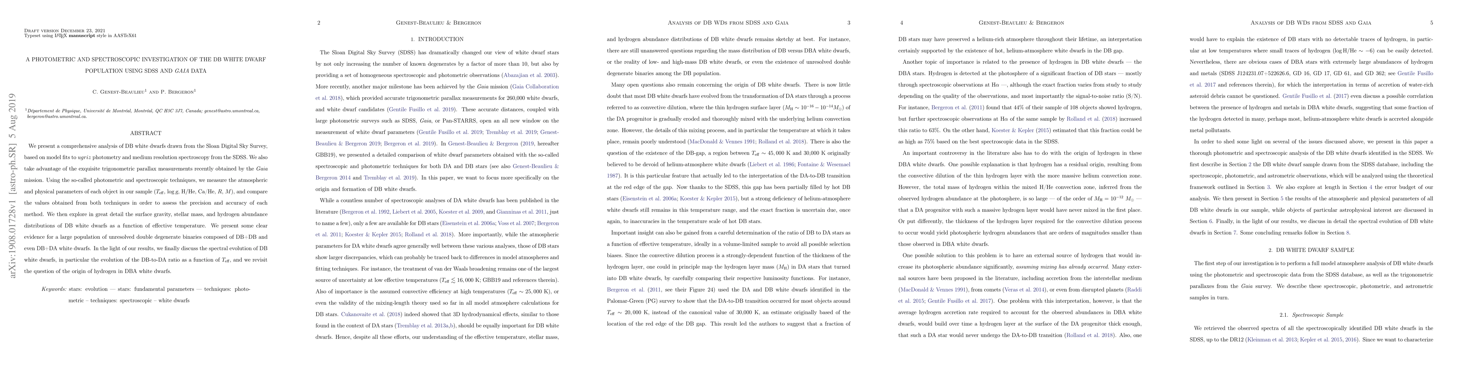 This paper analyzes DB white dwarfs using SDSS photometry and spectroscopy, and Gaia parallax data to determine atmospheric and physical parameters, revealing a significant population of unresolved double degenerate binaries and discussing the spectral evolution and hydrogen origin in DB white dwarfs.