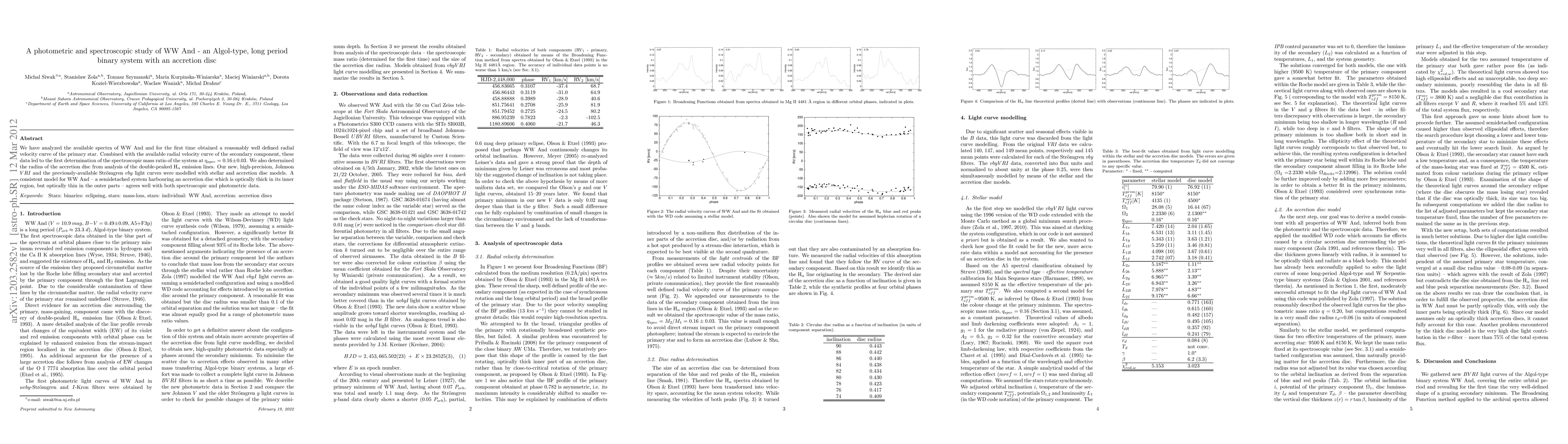 This study provides the first spectroscopic mass ratio for the Algol-type binary system WW And, determined to be q-spec = 0.16 +/- 0.03. The analysis also reveals the presence of an accretion disc, modeled to be optically thick in the inner region and thin in the outer parts, consistent with both spectroscopic and photometric data.